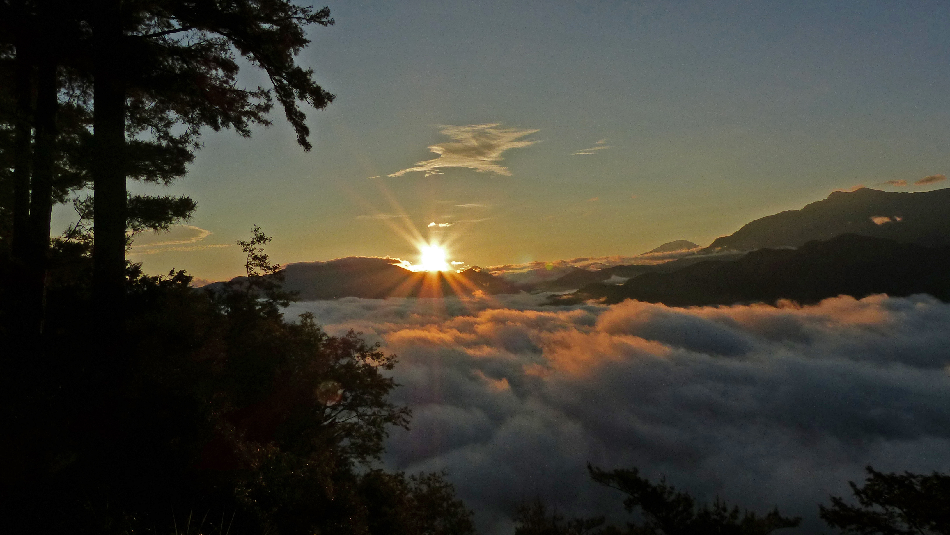 Alishan se situe à 2200 mètres au-dessus du niveau de la mer. À notre arrivée, le temps est tout simplement exécrable. Il pleut, il pleut et il pleut. Malgré tout, nous prenons le train à 4 heures du matin, dans l’espoir d’assister au sec au lever du soleil. Et ça marche! Au-dessus des nuages, l’ambiance est incroyable…