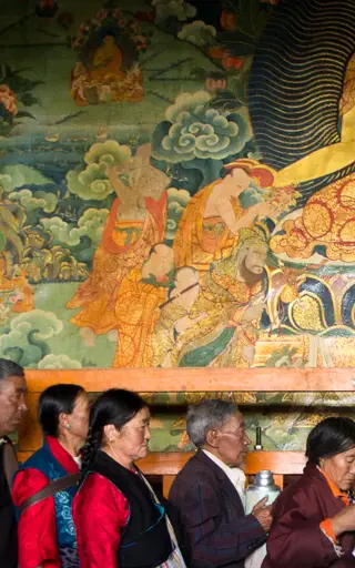 Im Herzen der Altstadt von Lhasa gelegen, ist der Jokhang ein zentrales Heiligtum der tibetischen Buddhisten. Hier kannst du zahlreiche Pilgerinnen und Pilger aus allen Regionen beobachten, die ihre Rituale zelebrieren und den Tempelkomplex umrunden. Diese eindrucksvolle Kulisse wird dich lange begleiten und unvergessliche Erinnerungen hinterlassen.