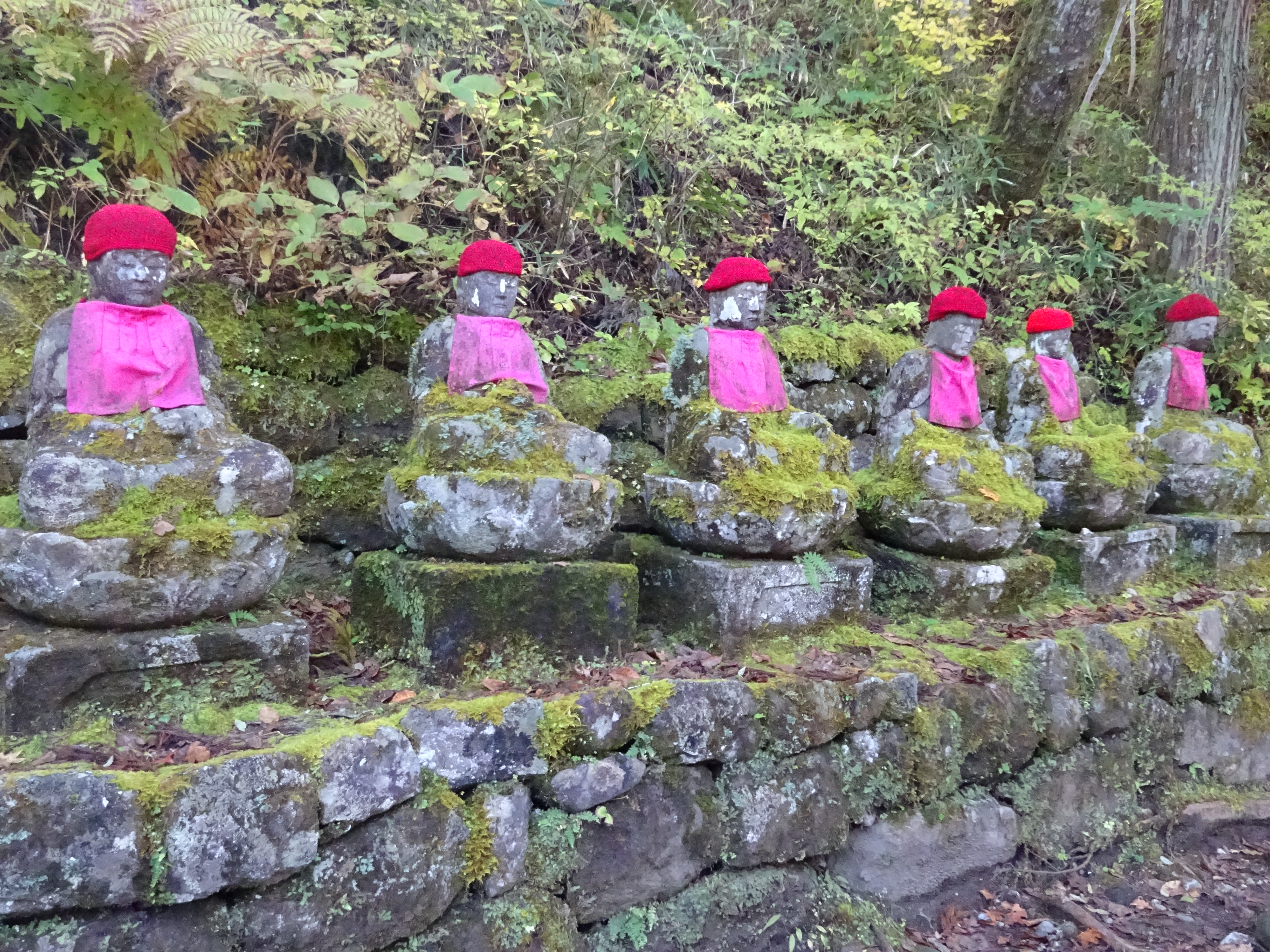 Jizo – im Shintoismus der Schutzpatron für alle ungeborenen und früh verstorbenen Kinder. Die Figuren prägen das Bild in einem saftig grünen Wald in Nikko.