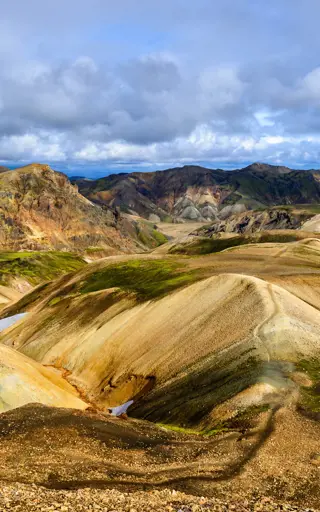 Diese isländischen Hügel wurden durch vulkanische Aktivitäten in früherer Zeit bunt eingefärbt und faszinieren durch ihre Rot-, Grün-, Gelb- und Weissfärbung.