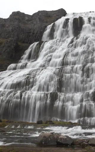 Der Gynjandi Wasserfall bietet einen spektakulären Anblick. Wie in Zeitlupe scheint das Wasser über 100 Meter ins Tal zu schweben. Unbedingt den Pfad hinaufsteigen und sich vom feinen Wassernebel erfrischen lassen.