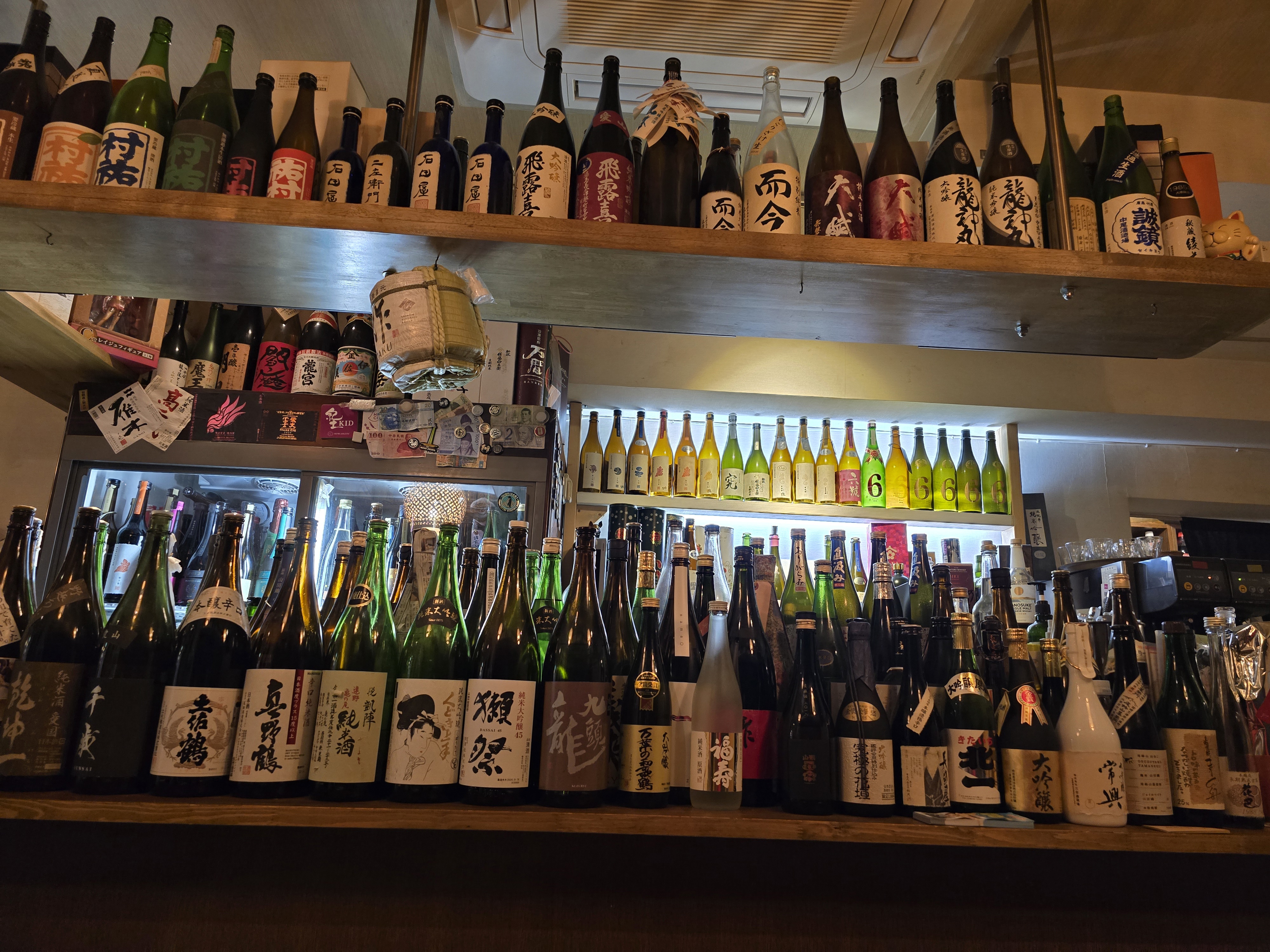 Bei unserem nächtlichen Streifzug vorbei an Osakas Dotonbori-Viertel entdecken wir eine gemütliche und authentische Sake-Bar. Diese beherbergt eine stattliche Auswahl an unterschiedlichen Exemplaren des bekannten Reisweins. Zum Erstaunen des Barbesitzers bestellen wir gleich zwei kleine Kännchen davon. Anscheinend machen wir einen nicht so trinkfesten Eindruck.