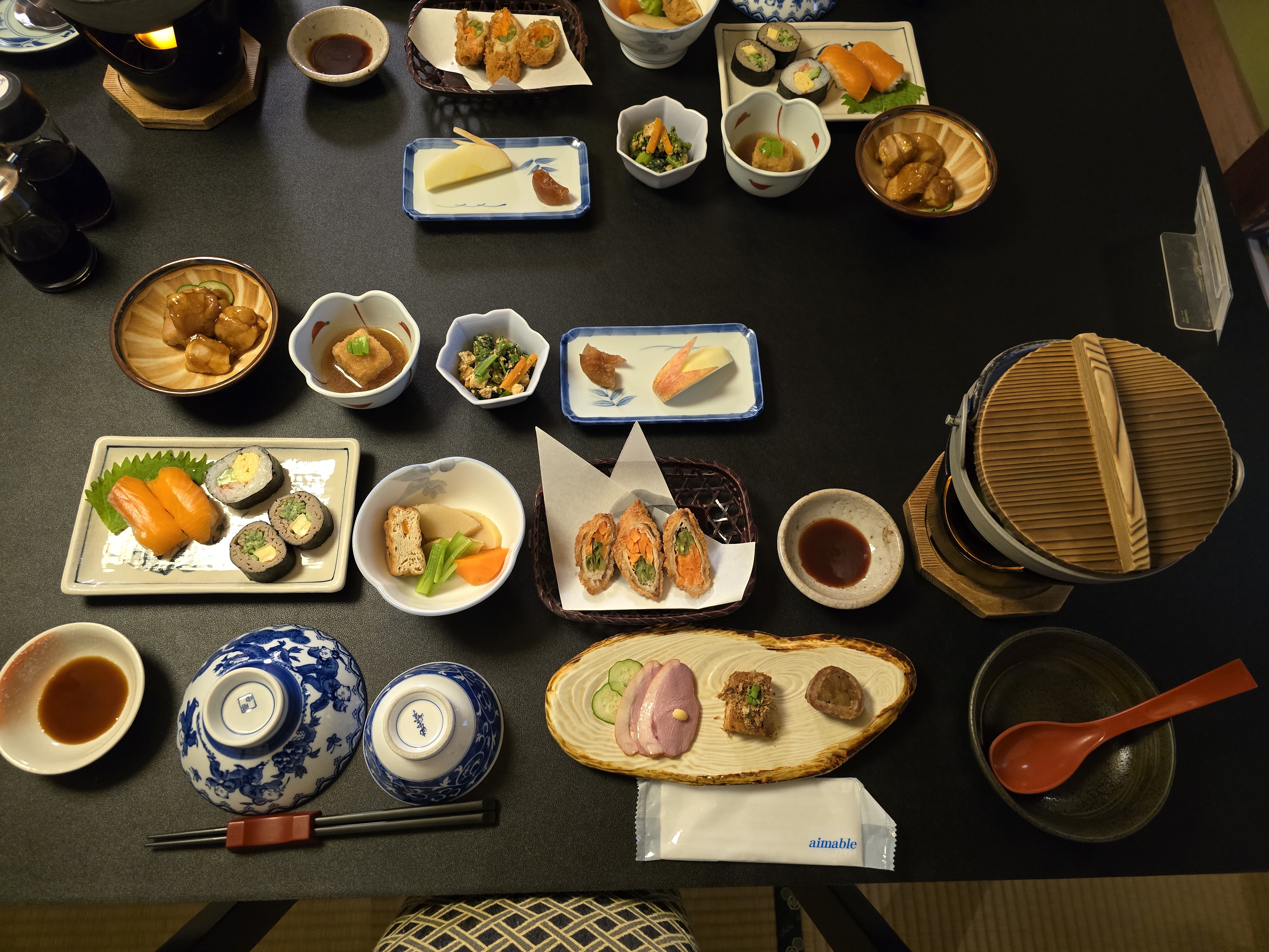 Abends werden wir in unserem Minshuku (japanisches Gästehaus) mit einer grossen Auswahl an japanischen Speisen verwöhnt. Der Reis kommt gemäss dem Gästehaus–Besitzer sogar aus eigener Produktion.
