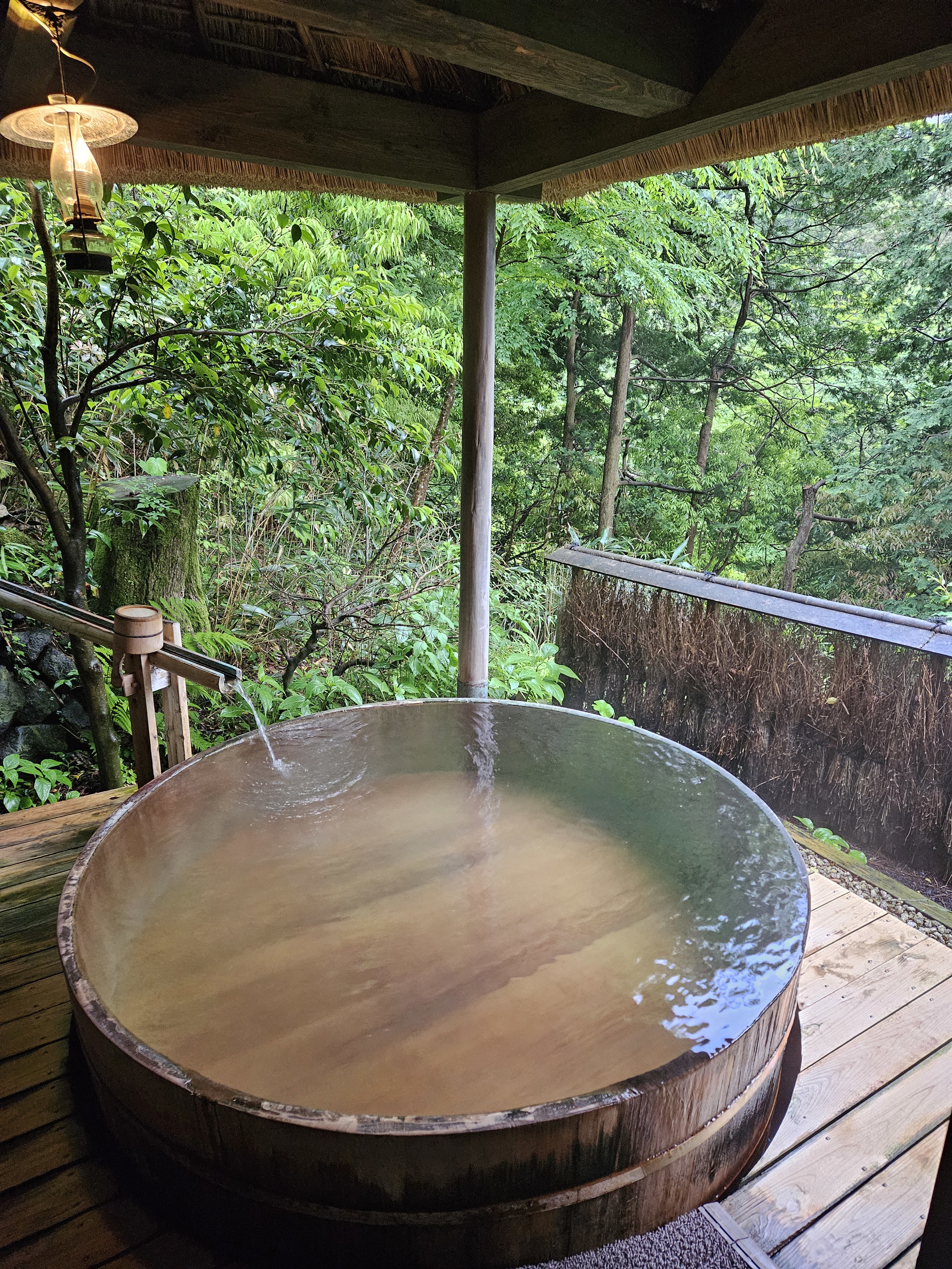 Der Mount Fiji bleibt uns leider während des ganzen Aufenthaltes verborgen, denn es regnet wie aus Giesskannen. Wir sind froh, dass unser Ryokan über mehrere Onsens verfügt. Im privaten Outdoor-Bad gönnen wir uns nach einem Tag draussen im Regen Entspannung und Wärme. Aber Achtung: Das Wasser kommt direkt aus den heissen Quellen und ist kochend heiss.