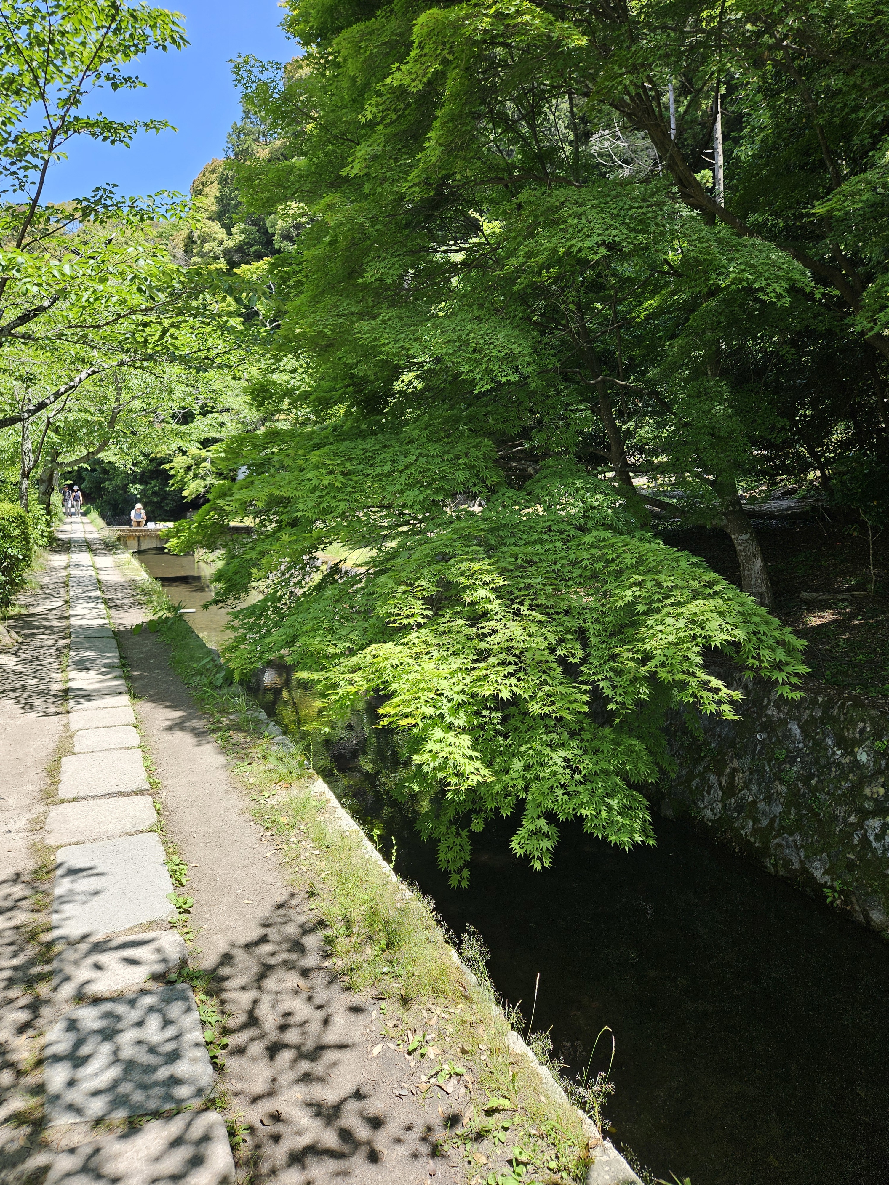 Um dem dichten Gewusel der Stadt Kyoto etwas zu entkommen, machen wir an diesem Morgen einen Ausflug etwas abseits der grossen Besucherströme. Entlang des Philosopher's Walk erwartet uns eine ruhige Atmosphäre und ein gemütlicher Spazierweg entlang des Flusses, gesäumt von schattenspendenden Bäumen. Unterwegs begegnen wir einem Japaner, der selber kleine Boote aus Bambus baut. Diese bietet er den Spazierenden kostenlos an und lädt sie dazu ein, die Boote von der kleinen Brücke aus in den Fluss gleiten zu lassen. Wessen Boot – wie vorgesehen – schön den Fluss hinuntergleitet, dem sei ein glückliches Leben vergönnt.