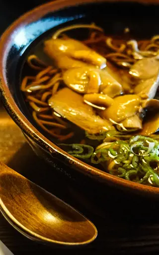 Auch an unserem letzten Abend kehren wir nochmals in ein Izakaya ein. Da wir nach den Häppchen noch nicht genug haben, gibt's zum Abschluss unseres Japan-Aufenthalts nochmals eine grosse Schüssel Ramen beziehungsweise Soba-Nudeln, natürlich bestellt am Automaten. Unser äusserst faszinierender und inspirierender Aufenthalt in Fernost endet also so, wie er begonnen hat – mit einen Topf klassischer Nudelsuppe.