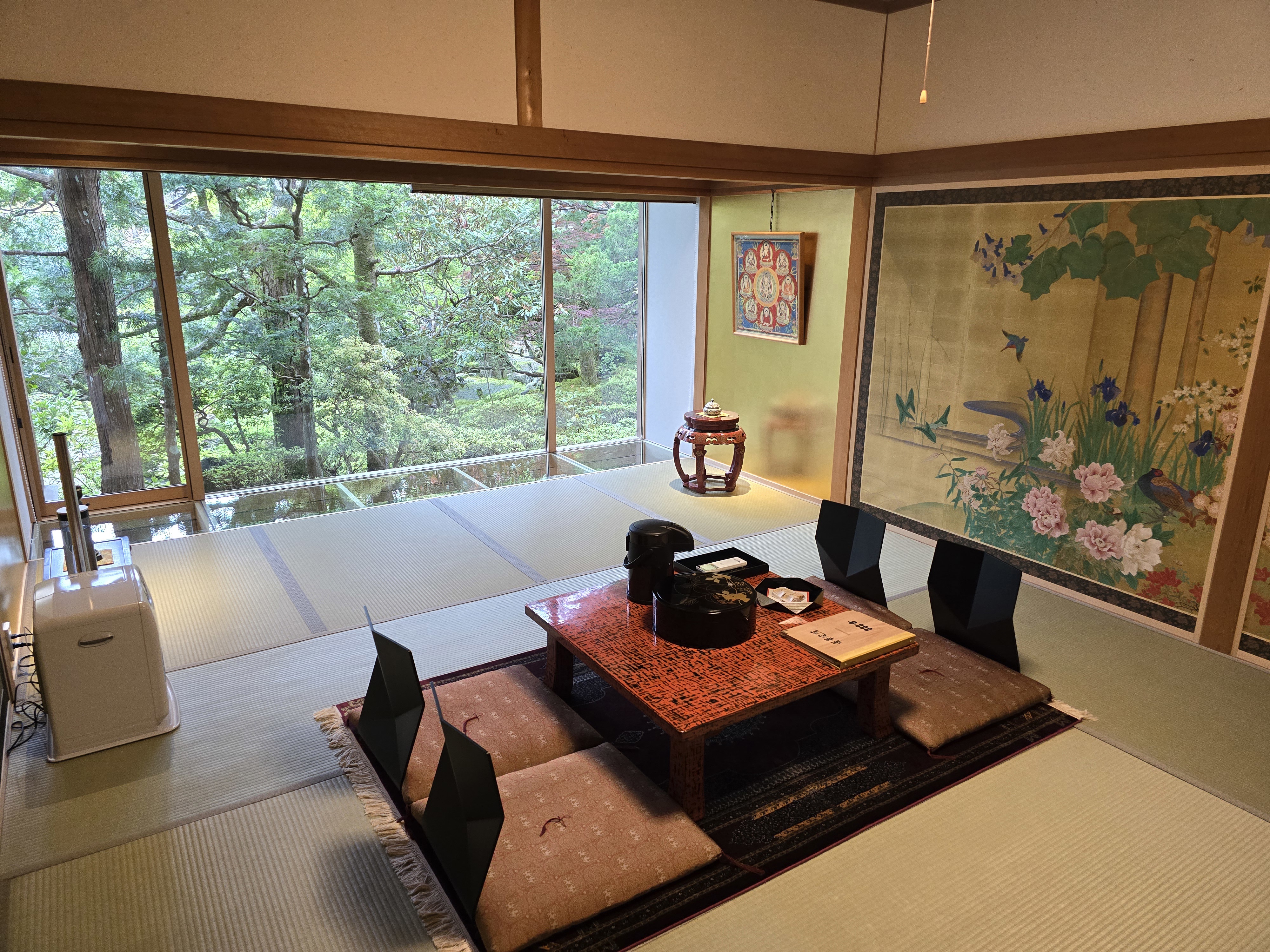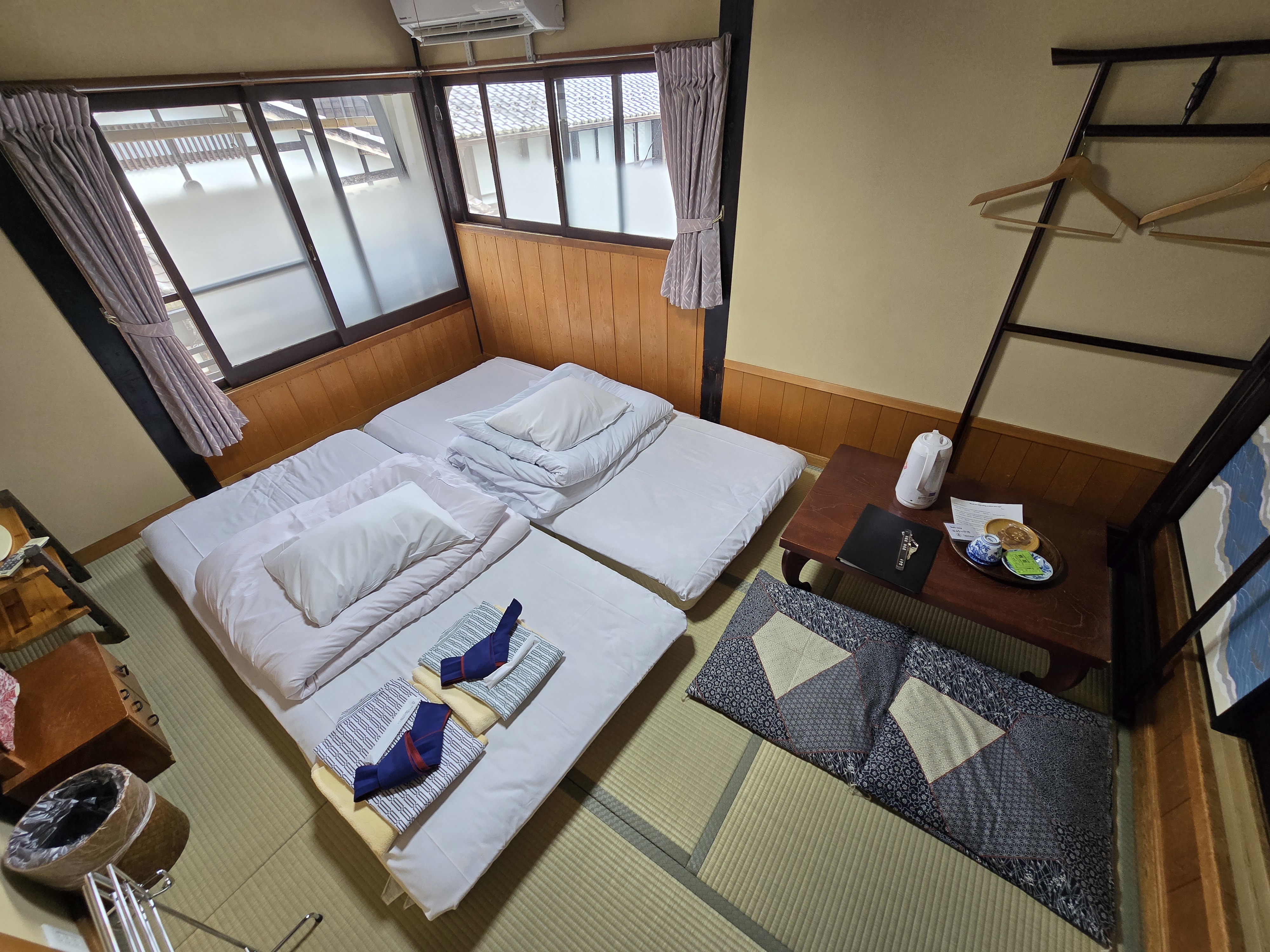 Gleich beim Eingang zu unserem Zimmer erstreckt sich ein kleiner Indoor-Zen-Garten. Frühstück und Abendessen werden uns auf dem Zimmer serviert, gegessen wird traditionellerweise am Boden. Abends nach dem Essen werden die typischen Futons ausgerollt und unser Bett wird für die Nacht hergerichtet.