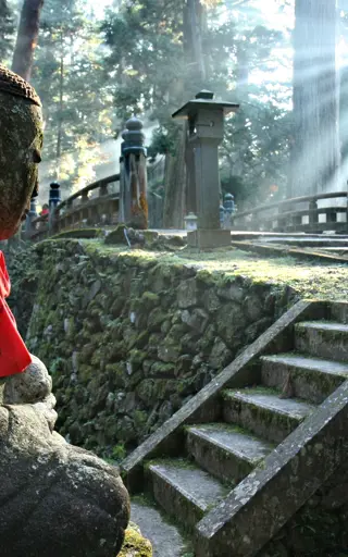 Koya-san liegt auf gut 900 Metern, und die Anfahrt mit dem Zug ist atemberaubend. Von Kyoto sind es gut 2,5 Stunden durch das wunderschöne japanische Hinterland. Langsam kann man zusehen wie Wolkenkratzer und urbanes Leben durch Natur und kleine Siedlungen abgelöst werden. Der letzte Teil wird mit einer Standseilbahn zurück gelegt, die einen durch diesen dichten Wald auf den Berg hinauf bringt.
