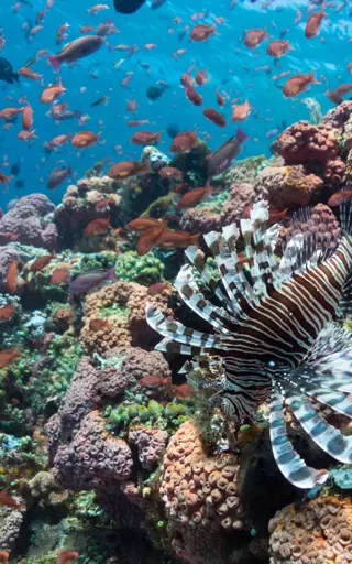Schwerelos erfreuen wir uns der betörenden Unterwasserwelt. Mit Kennerblick spürt unser Tauchguide gut getarnte Drachenköpfe auf. Man könnte meinen, die skurrilen Kreaturen seien mit der Koralle verwachsen. Die farbenprächtigen Korallengärten strotzen vor unglaublicher Vielfalt.