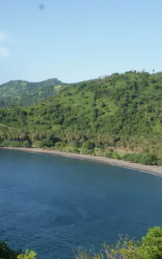 Beeindruckt schlendern wir vom Kratersee wieder zur Küste hinab und weiter bis zu einem schwarzen Strand. Der Sand unter unseren Füssen erzählt von der Hitze des Tages. In unserem Blickfeld erhebt sich der Vulkankegel von Pulau Hiri, eine kleine Nachbarinsel.