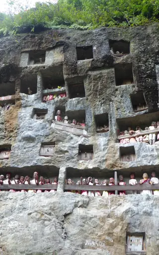 Die Toraja sind ein Volk, das im Süden Sulawesis zuhause ist. Mitten zwischen weiten Reisfeldern sieht man ihre charakteristischen Hütten. Doch besonders ihr Beerdigungs- und Totenkult macht die Gegend so spannend. Es werden grosse Zeremonien mit Opfergaben abgehalten zu Ehren der Toten, und die Felsgräber dieses Volkes sind weltberühmt.