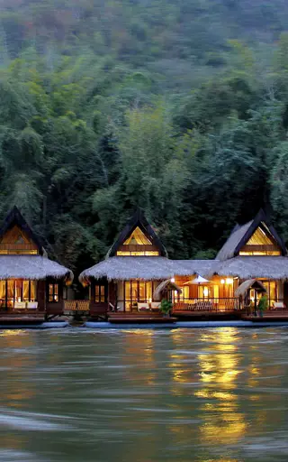 Die schwimmenden Hotels bieten ein aussergewöhnliches Wohnerlebnis. Auf dem Kwai Fluss schwimmen die Bungalows, umgeben von dichtem Dschungel. Jede einzelne Haus hat dabei seine eigene kleine Terrasse die direkt auf den Fluss hinaus zeigt und gibt einem ein Gefühl von Abenteuer mit einer guten Portion Luxus.