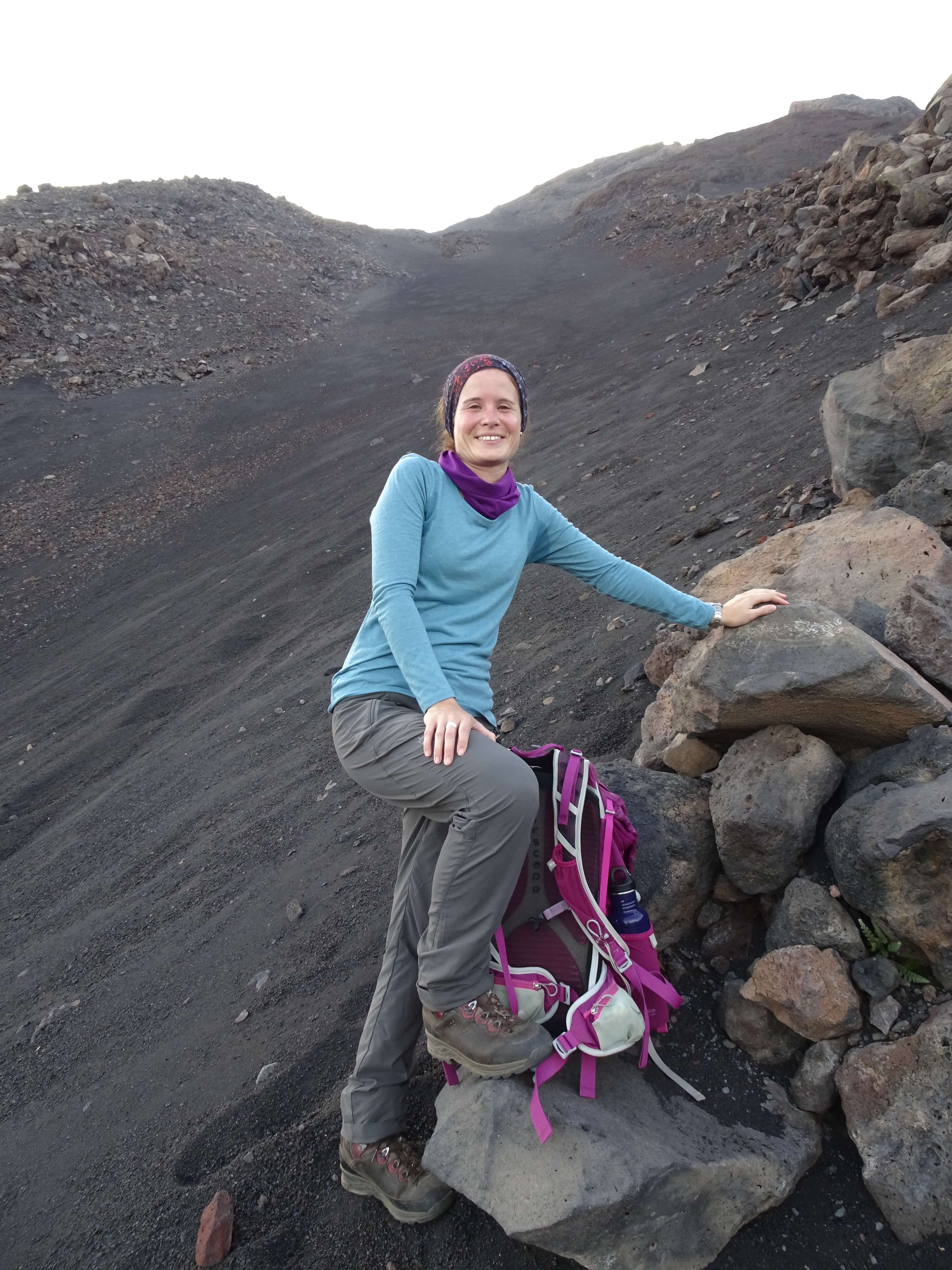Frühes Aufstehen lohnt sich – mit unserem Privatguide, der im Dorf in der Caldera aufgewachsen ist, gehts um sechs Uhr morgens los. Der erste Abschnitt ist sandig, dann folgt eine abwechslungsreiche Kletterpartie, und bald schon blicken wir über das tiefer liegende Wolkenmeer. Nach ca. dreieinhalb Stunden Aufstieg stehen wir glücklich auf 2829 m ü. M.. Hier oben geniessen wir Schokolade, und unser Guide bietet uns frische Papaya an.