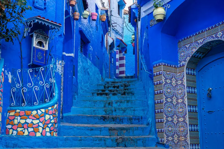 Die blaue Altstadt von Chefchaouen verzaubert mit engen, verwinkelten Gassen und Häusern in traumhaftem Blau. Schlendere durch Märkte voller bunter Stoffe und Gewürze, entdecke lokale Kunsthandwerke oder geniesse frischen Minztee auf einer Terrasse mit Blick auf die Rif-Berge. Eine einzigartiger Atmosphäre!