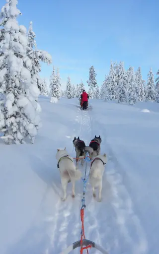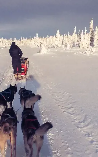 Nachdem die Schlitten mit der notwendigen Ausrüstung bepackt sind, geht das fantastische Abenteuer los: Die Strecke führt durch endlose, tiefverschneite Birkenwälder. Hier zählt die Zusammenarbeit zwischen Mensch und Tier, die zu einer tiefen Freundschaft führen kann.