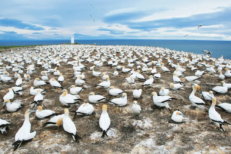 Spaziere bei Ebbe zu der grössten Tölpel Kolonie Australasiens und beobachte die weissen Vögel mit Ihrer orangen Haube. Unterwegs wirst du dramatische Schichtsteinformationen passieren und in den Felsen fossile Muschelformen vorfinden.