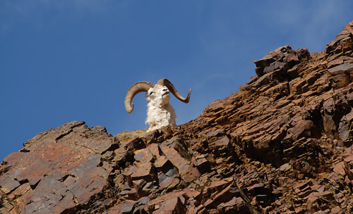 Wer sitzt denn da auf einem Felsen, und lässt sich von keiner Menschenseele stören. Dieses Dallsheep jedenfalls bleibt die Ruhe selbst. Wow, welch Glück wir haben – bis jetzt haben wir diese Tiere nur aus grosser Distanz gesehen – kleine weisse Punkte irgendwo an einem Berghang. Sieht ganz anders aus, aus der Nähe.