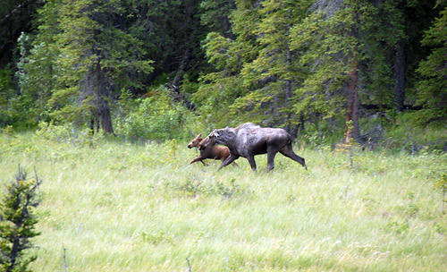 Richtung Denali-Nationalpark wird’s immer einfacher mit dem Erspähen der Tiere. Hier eine Elchkuh mit ihrem Jungtier, da ein Karibubulle oder in der Weite sogar ein Wolf. Alaska – ein Tier- und Naturparadies.