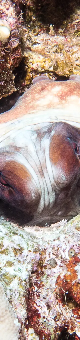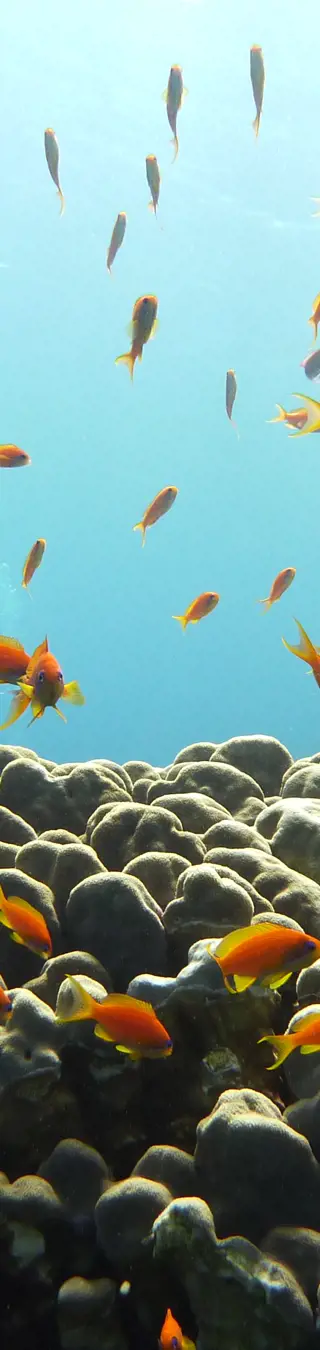 Bereits in 6 Metern Tiefe siehst du es, das Wrack der Al Munasir. Wegen seiner Schräglage senkt es sich bis auf 30 Meter hinunter. Viele Korallen haben sich darauf niedergelassen, aber vor allem wimmelt es von Fischen. Du findest dich mitten in Schwärmen von Schnappern, Füsilieren und anderen Fischen wieder. Erkunde die Brücke von innen, auch wenn du die ehemalige Kommandozentrale möglicherweise mit einer Muräne teilst.