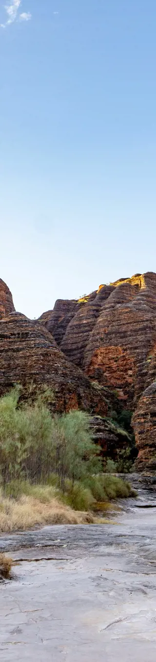 Die einzigartigen Felsformationen, die an Bienenkörbe erinnern, befinden sich im Purnululu Nationalpark. Nur wenige Pfade durchziehen diese Landschaft, wobei der Grossteil entweder nicht zugänglich ist oder nur mit einem Allradfahrzeug über Schotterpisten erreicht werden kann. Dennoch ist eine kurze Wanderung durchaus möglich.