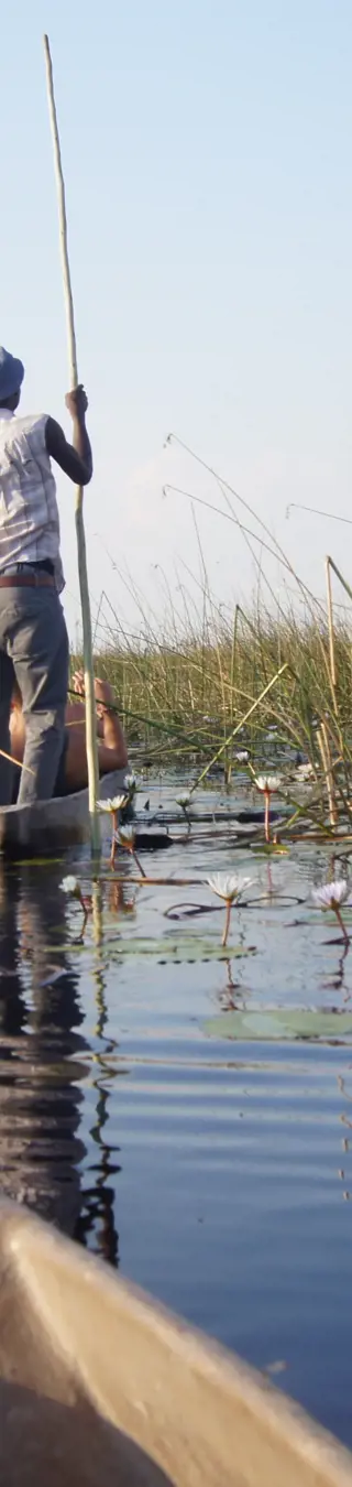 Eine unvergessliche Erfahrung beim Besuch des Okavango-Deltas ist eine Fahrt mit einem Mokoro. Diese Einbaumboote gleiten gemächlich durch die schilfbestandenen Kanäle und werden von einem einheimischen Fahrer sicher gesteuert, der sie mit einem langen Holzstab vorantreibt. So kannst du die Flora und Fauna kennenlernen und dem leisen Plätschern des Wassers lauschen.