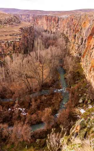 Von den Höhen Güzelyurts führt der Weg hinunter zur malerischen Ihlara-Schlucht, durch die der Melendiz fliesst und das weite Tal in eine üppige Oase verwandelt. Auf idyllischen Singletrails erkundest du die grüne Felslandschaft entlang ihres kurvenreichen Pfads und stösst dabei immer wieder auf beeindruckende Höhlenkirchen, die in die Steilwände eingebettet sind.