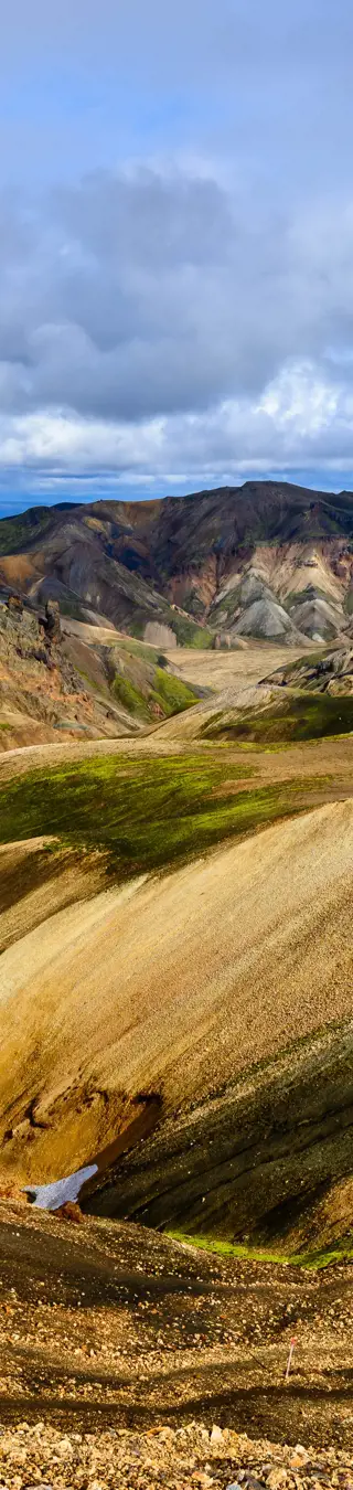 Frühmorgens fährt der Linienbus vom BSI Busterminal in Reykjavík nach Landmannalaugar. Du fährst vorbei am Vulkan Hekla und kommst gegen Mittag im farbenprächtigen Landmannalaugar an. Die Hügel hier wurden durch vulkanische Aktivitäten in früherer Zeit bunt gefärbt und faszinieren heute durch ihre Rot-, Grün-, Gelb- und Weissfärbung. Nach dem Mittagessen startet das Trekking in Richtung Süden. Der Pfad führt vorbei an kleinen Schluchten, den heissen Quellen von Stórihver und markanten Bergen. Im Verlauf des späten Nachmittags Ankunft in Hrafntinnusker, wo du in der Berghütte übernachtest.