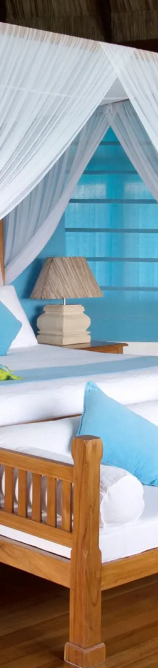 Die 27 Deluxe Villas (87 m²) auf der Ostseite der Insel verfügen über ein Himmelbett und haben zusätzlich eine Badewanne sowie einen kleinen Pool vor dem Bungalow.