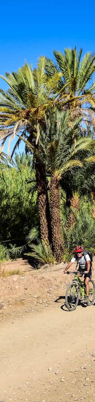 Wir biken im Schatten von Tausenden von Palmenhainen durch das fruchtbare Draa-Tal von Oase zu Oase. Im Frühling wird hier Gemüse angebaut, und im Herbst dürfen wir süsse Datteln direkt von den Palmen naschen. Nach dem Mittagessen fahren wir in den Begleitfahrzeugen nach Ouarzazate und beziehen dort eine traditionelle Kasbah, die einen atemberaubenden Blick auf die Gipfel des Atlasgebirges bietet.