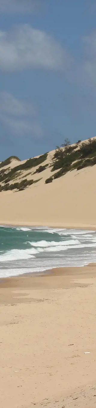 Wir biegen entlang der Küste nach Süden zu einer abgelegenen Fischerhütte am Strand nördlich der Stadt Xai-Xai ab. Die Lodge liegt an den Küstendünen und bietet einen herrlichen Blick auf den umliegenden natürlichen Busch und den weitläufigen Strand. Bei Ebbe liegt ein langes felsiges Riff parallel zum Strand, wodurch ein flacher, ruhiger Pool entsteht, der ideal zum Schnorcheln und Schwimmen geeignet ist. Für unsere letzte Nacht am Strand geniessen wir einen Fisch Braai (Grill) im Lodge-Restaurant mit Blick auf den Indischen Ozean.