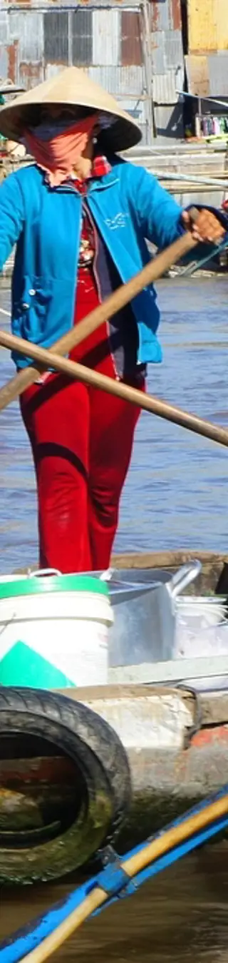 Vom Hotel aus gelangen wir mit dem Boot zu den schwimmenden Märkten und bestaunen den Handel. Der Bus bringt uns danach zum Start unserer heutigen Etappe. Die Strecke gestaltet sich wieder sehr vielseitig und abwechslungsreich entlang idyllischer Dörfer mit geschäftigem Treiben. Nach dem Mittagessen geht die Reise im Bus weiter nach Chau Doc. Unser Hotel liegt direkt am Mekong und wir haben Gelegenheit das unermüdliche Treiben auf dem breiten Fluss zu beobachten.