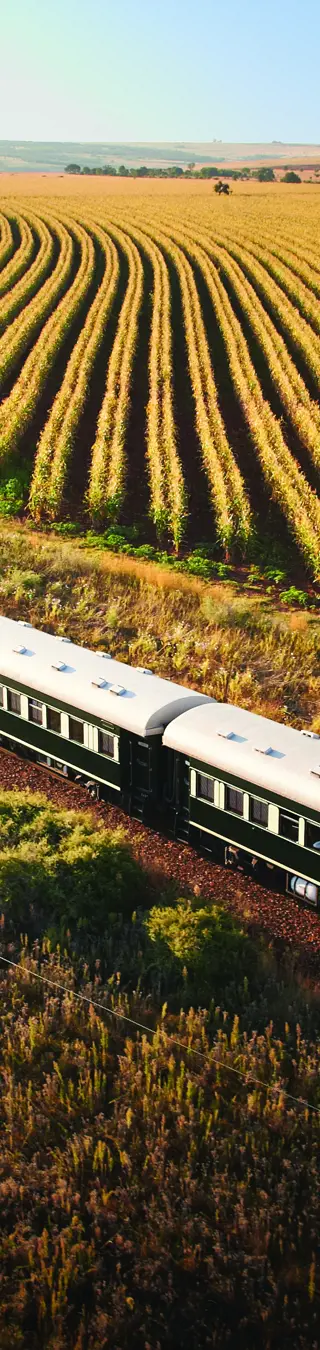 Geniesse die Weiten der afrikanischen Landschaft vom komfortablen, offenen Balkon des Aussichtswagens aus. Es gibt kaum eine exklusivere Möglichkeit, die Schönheit des südlichen Afrikas zu erleben. Der restaurierte Luxuszug aus den 30er Jahren bietet neben einer nostalgischen und romantischen Atmosphäre auch eine hervorragende Küche – ein erstklassiges Erlebnis. Die drei Suiten-Kategorien sind auf höchstem Niveau ausgestattet.