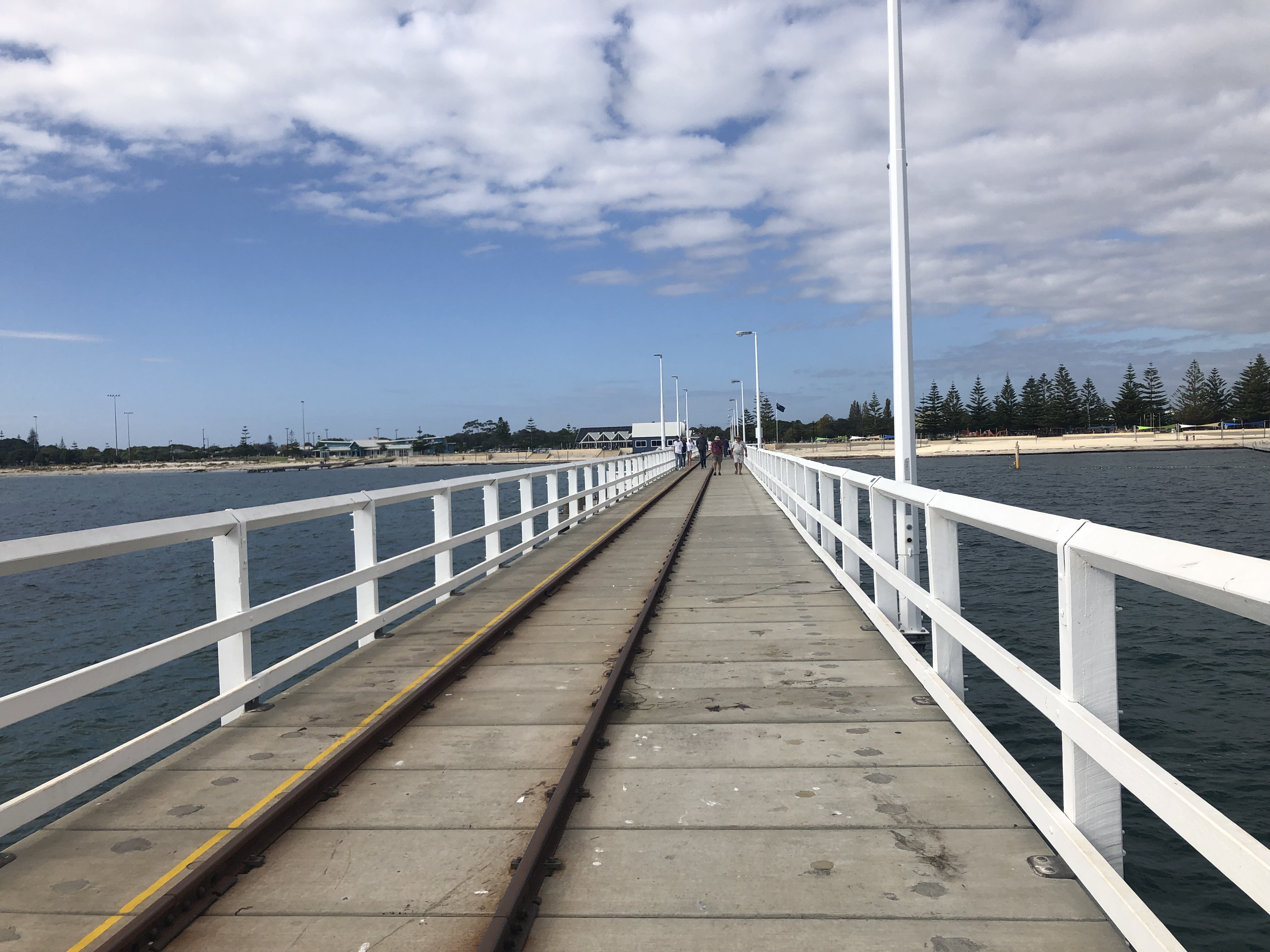 Auf dem Weg zurück nach Perth besichtigen wir den längsten Steg der Welt, den Busselton Jetty. Wer die zwei Kilometer nicht zu Fuss machen will, kann auch den kleinen Zug bis zum Ende nehmen.