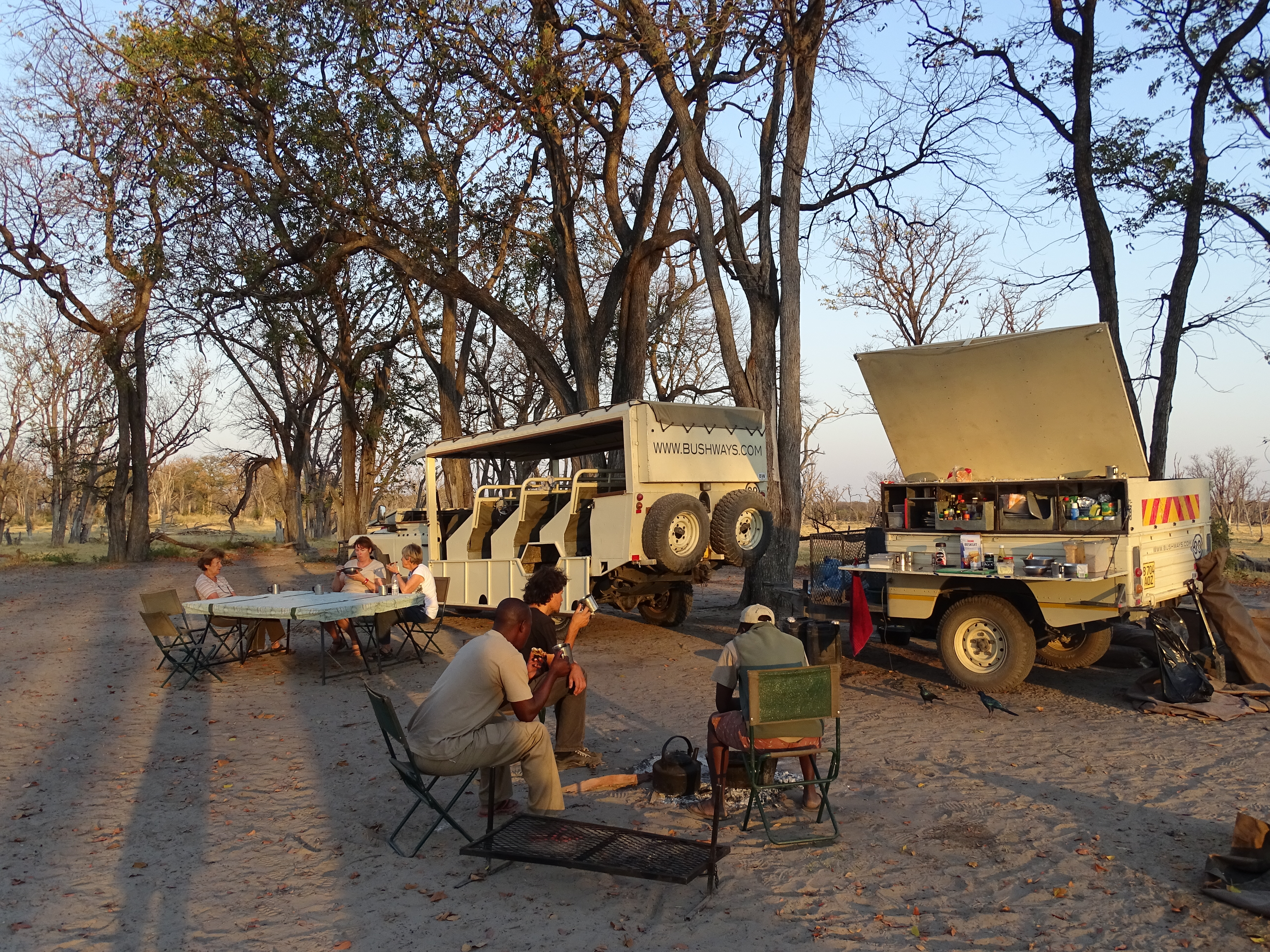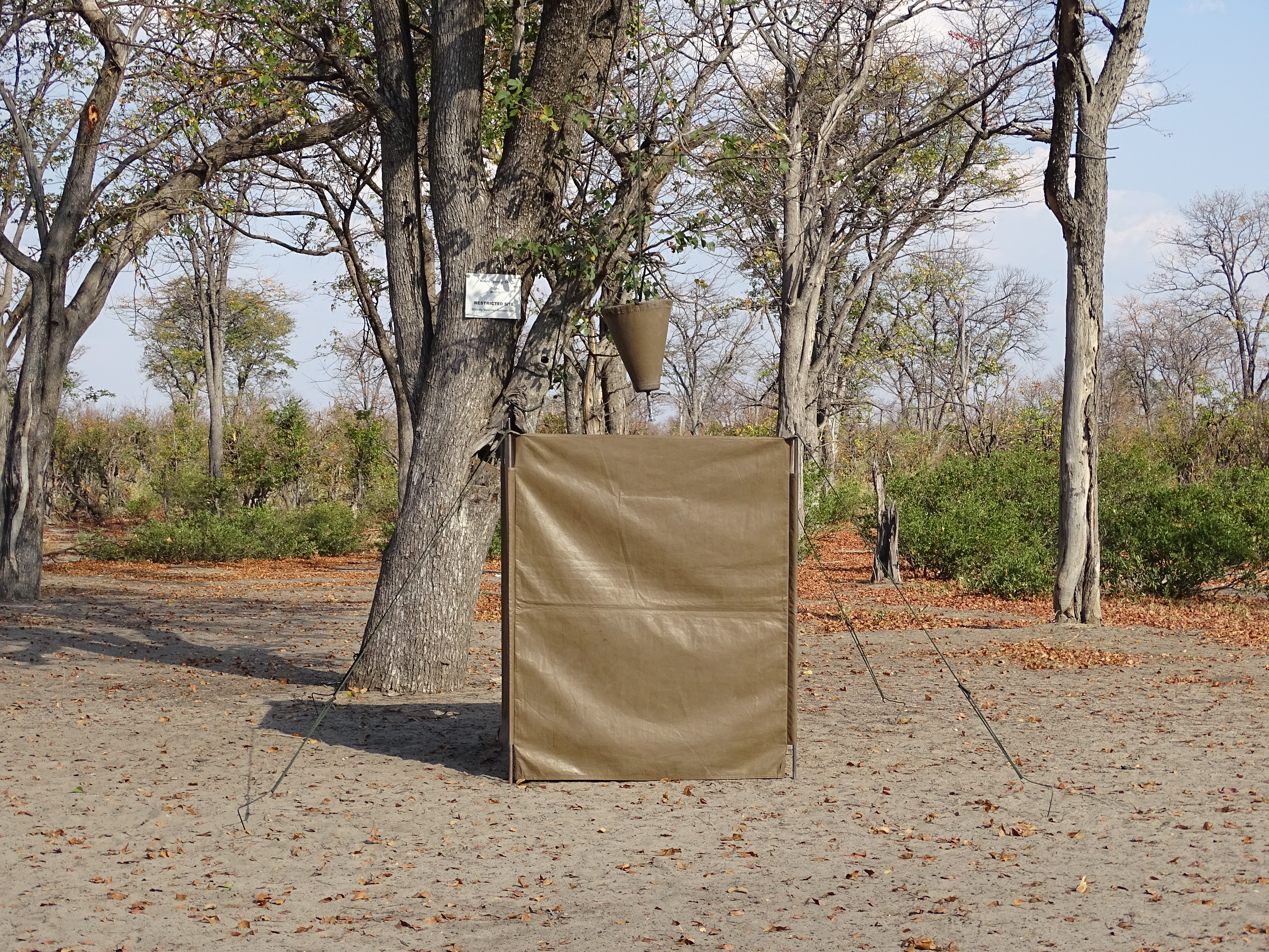 Zum Glück gibt es im Camp auch eine Dusche. Abends am Lagerfeuer wird gerne die Geschichte erzählt, wie sich ein Elefant an das Wasser der Dusche geschlichen hat und so das Duschvergnügen eines Safaritouristen etwas verkürzt hat. Als Buschtoilette fungiert eine WC-Brille über einem Loch im Boden. Statt Wasserspülung kommt eine Schaufel Sand über das Geschäft.