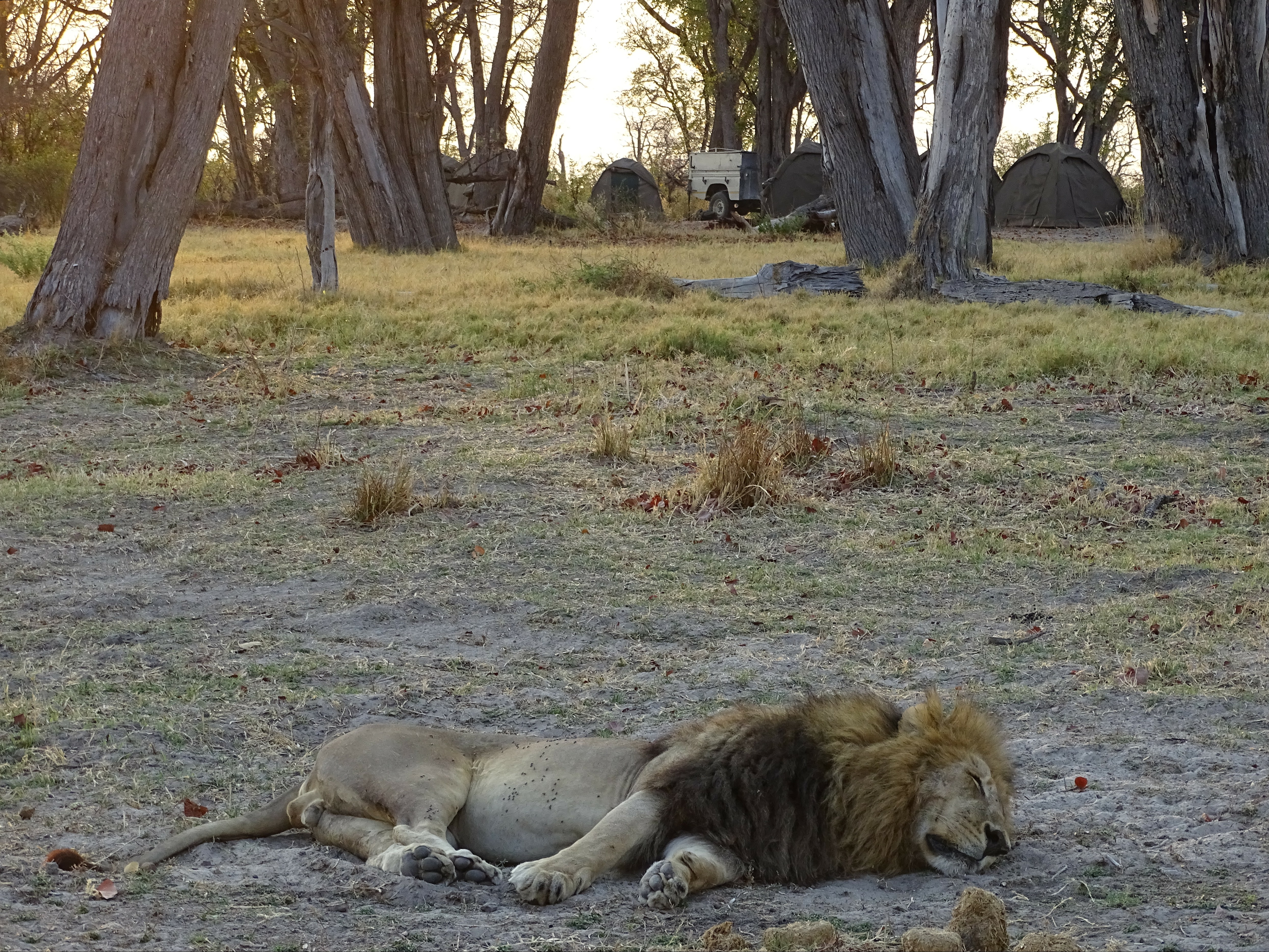 Schon bald erreichen wir unser erstes Camp. Der sandige Boden ist mit frischen Löwenspuren übersät. Deshalb sollten wir zur Sicherheit für diese Nacht besser die Jalousien der Zelte runterlassen. Kaum befinden wir uns im Zelt, macht sich der Spurenleger auch bereits lautstark bemerkbar.