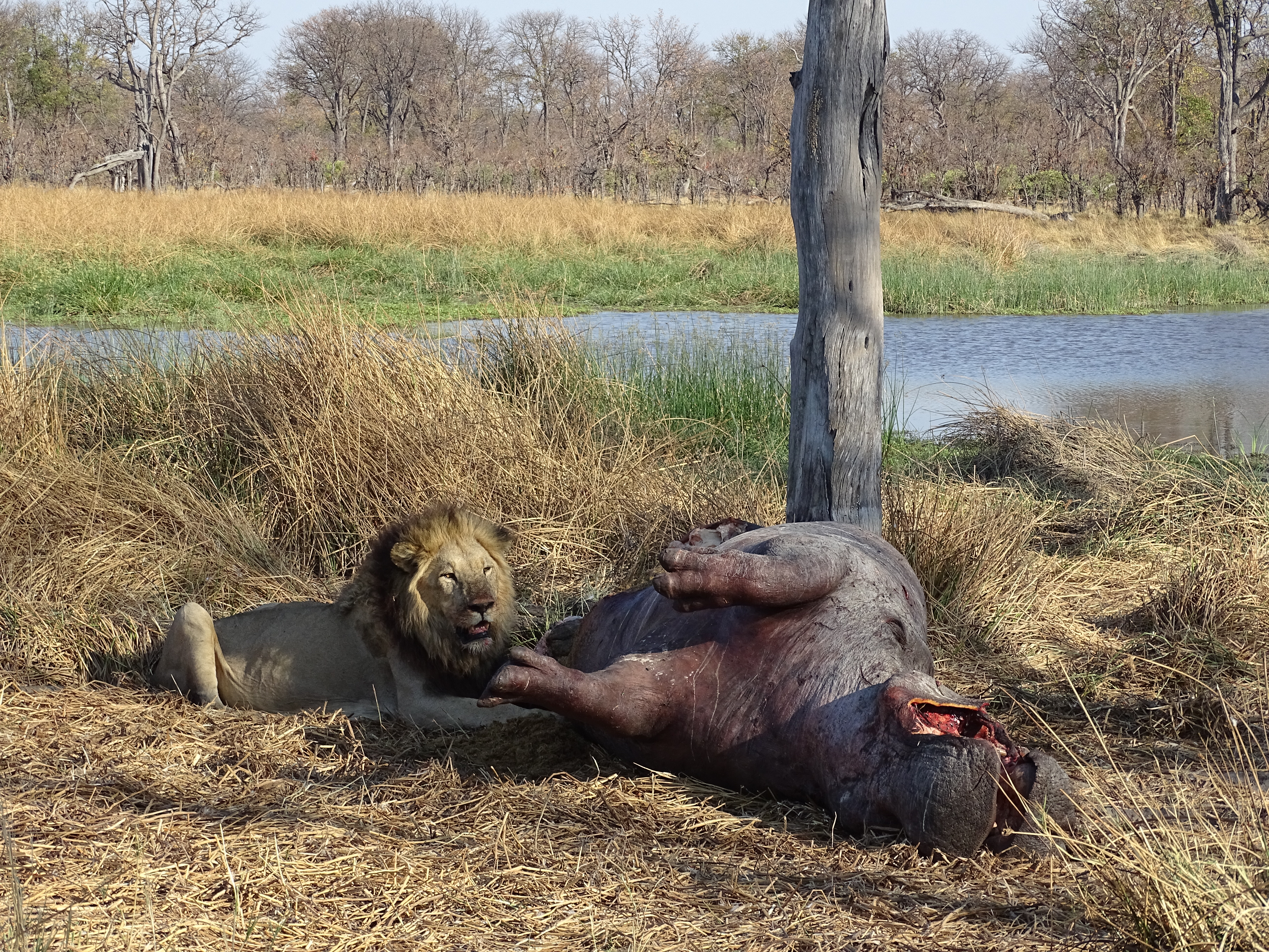 Wenig später treffen wir erneut auf unseren Löwen vom Campingplatz. Gerade vertilgt er seinen Lunch. Ein Hippo hat sich kürzlich beim Kampf mit einem Artgenossen tödliche Verletzungen zugezogen. Unser Guide meint, dass der Löwe sehr hungrig sein muss, dass er sich mit Aas zufrieden gibt. Irgendwie beruhigend zu wissen, dass Löwen Aas den Touristen vorziehen. Unser Guide meint dazu lakonisch: «Solange du nicht läufst wie eine Antilope oder läufst wie ein Warzenschwein, bist du sicher».