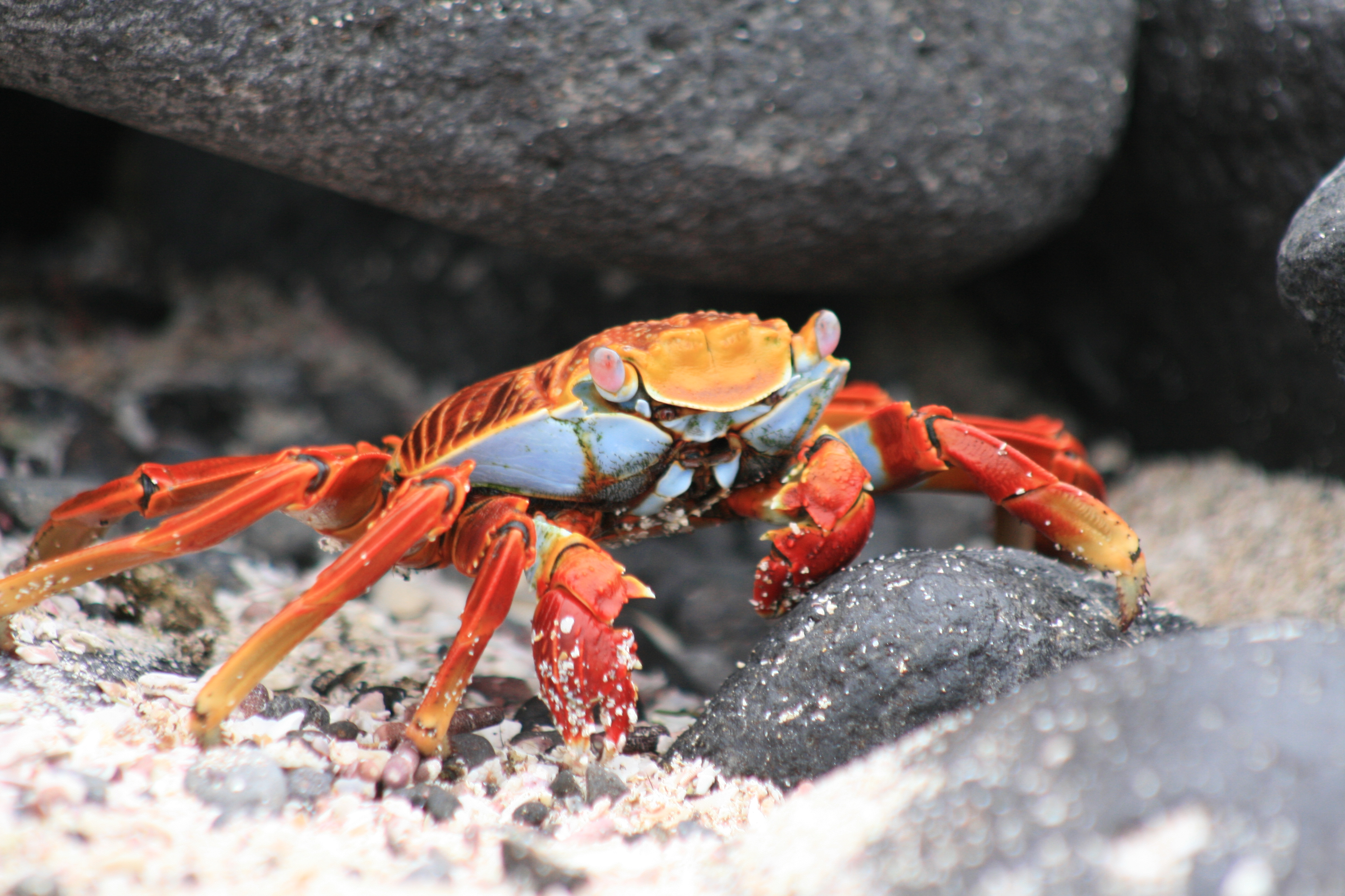 Die Sally-Lightfoot-Krabbe, auch als Klippenkrabbe bekannt, ist auf den Galapagos-Inseln – insbesondere auf der Insel Española – allgegenwärtig. Mit ihren leuchtenden Farben und ihrer flinken, fast tänzerischen Bewegung zieht sie sofort die Aufmerksamkeit auf sich. Diese farbenfrohen Krabben bevölkern die felsigen Küsten der Inseln und bieten einen faszinierenden Anblick, wenn sie sich geschickt über die Klippen bewegen.