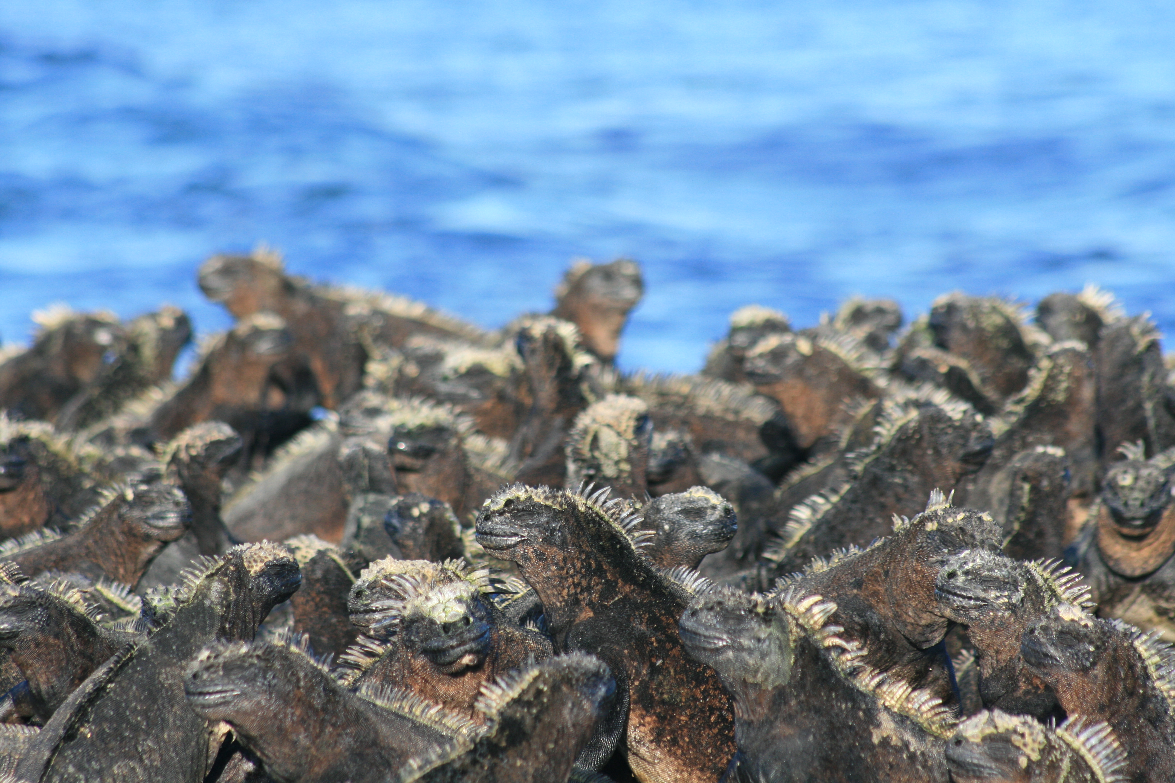 Beim Punta Espinoza bot sich uns ein beeindruckendes Bild: Hunderte von Meerechsen lagen dicht an dicht auf den schwarzen Felsen und wärmten sich in der Sonne, um sich von ihren Tauchgängen im kühlen Meer zu erholen. Diese Echsen sind die einzigen ihrer Art, die ihre Nahrung aus dem Meer beziehen – sie tauchen nach Algen, die sie von den Felsen unter Wasser abweiden. Die Meerechsen sind endemisch auf den Galapagos-Inseln und kommen auf fast allen Inseln vor, doch besonders hier, am Punta Espinoza, kann man sie in grosser Zahl beobachten.