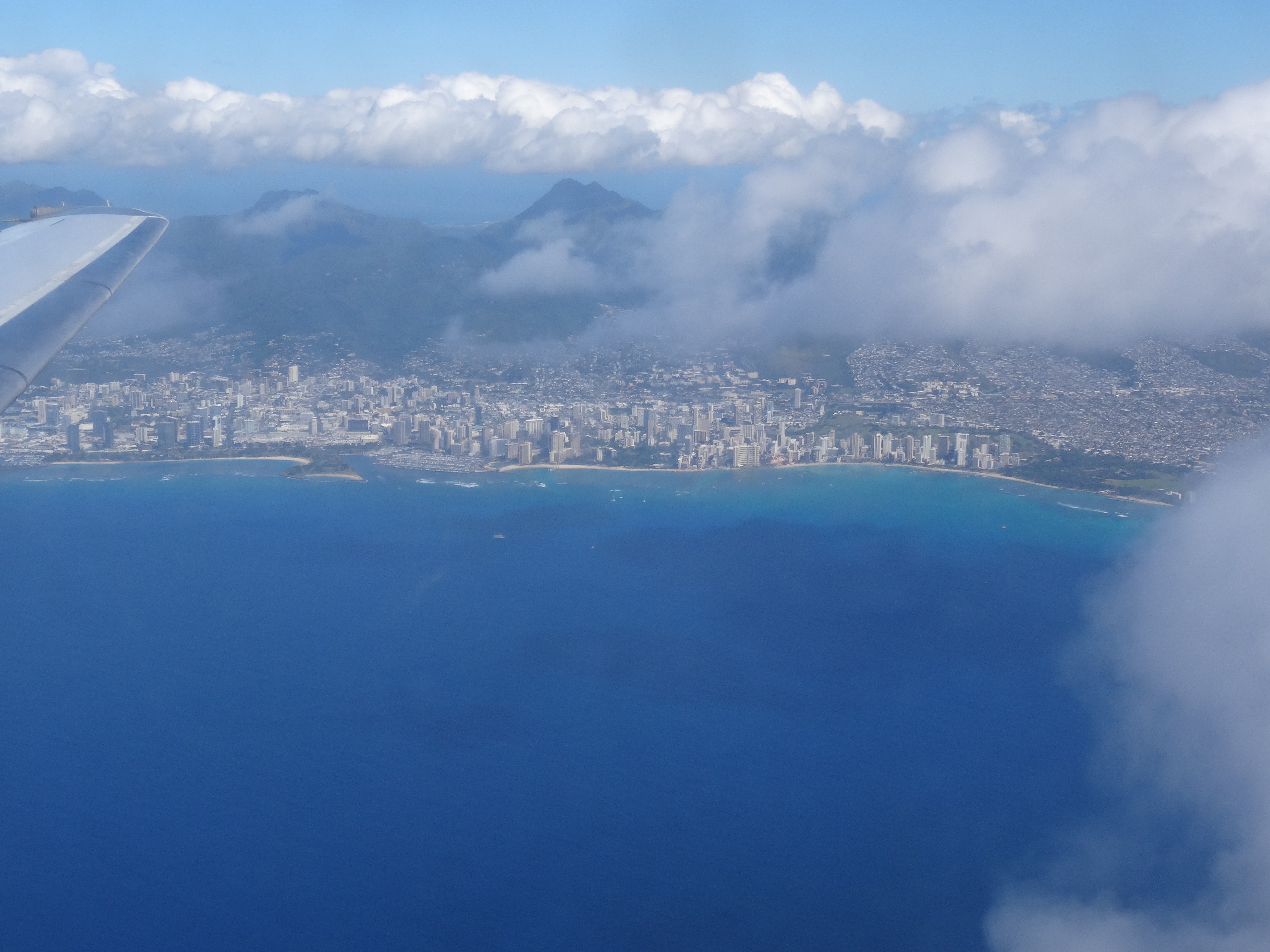Weil das Tiefdruckgebiet, das uns schon auf Big Island besuchte, mit uns auf Maui reiste, ist die Woche auf Maui sehr regnerisch. Neben tollen Stränden wie den Fleming Beach Park oder den Big Beach (Makena Beach) wäre auch der Haleakala Vulkan auf 3055 m ü. M zu Sonnenaufgang ein Besuch wert. Aber bei Dauerregen und Nebel auf dem Vulkangipfel, entscheiden wir, die Insel zu wechseln und fliegen nach Oahu. Beim Anflug können wir bereits einen ersten Blick auf Waikiki Beach erhaschen.