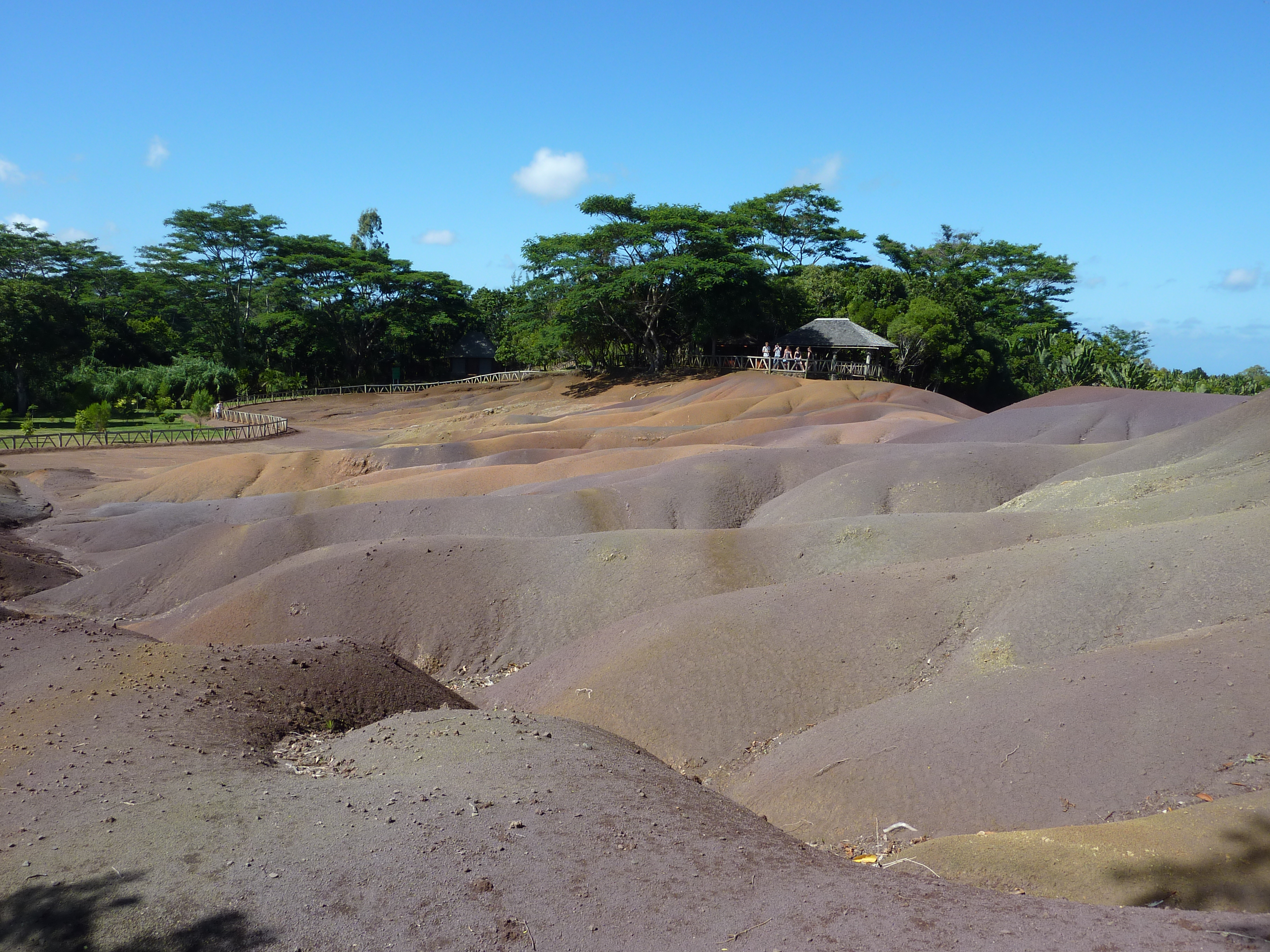 Im Südwesten , ca. 5 km von Chamarel kann man diese "Farbige Erde" besuchen. Vom Aussichtspunkt hat man einen tollen Überblick auf kahle, rotbraune Lavaformationen. Das wellige Gestein leuchtet zur jeder Tageszeit unterschiedlich; das Naturphänomen wird mit der Ansammlung von hochkonzentriertem Eisen und Aluminium im Gestein erklärt. Ganz in der Nähe befinden sich die Chamarel Falls.