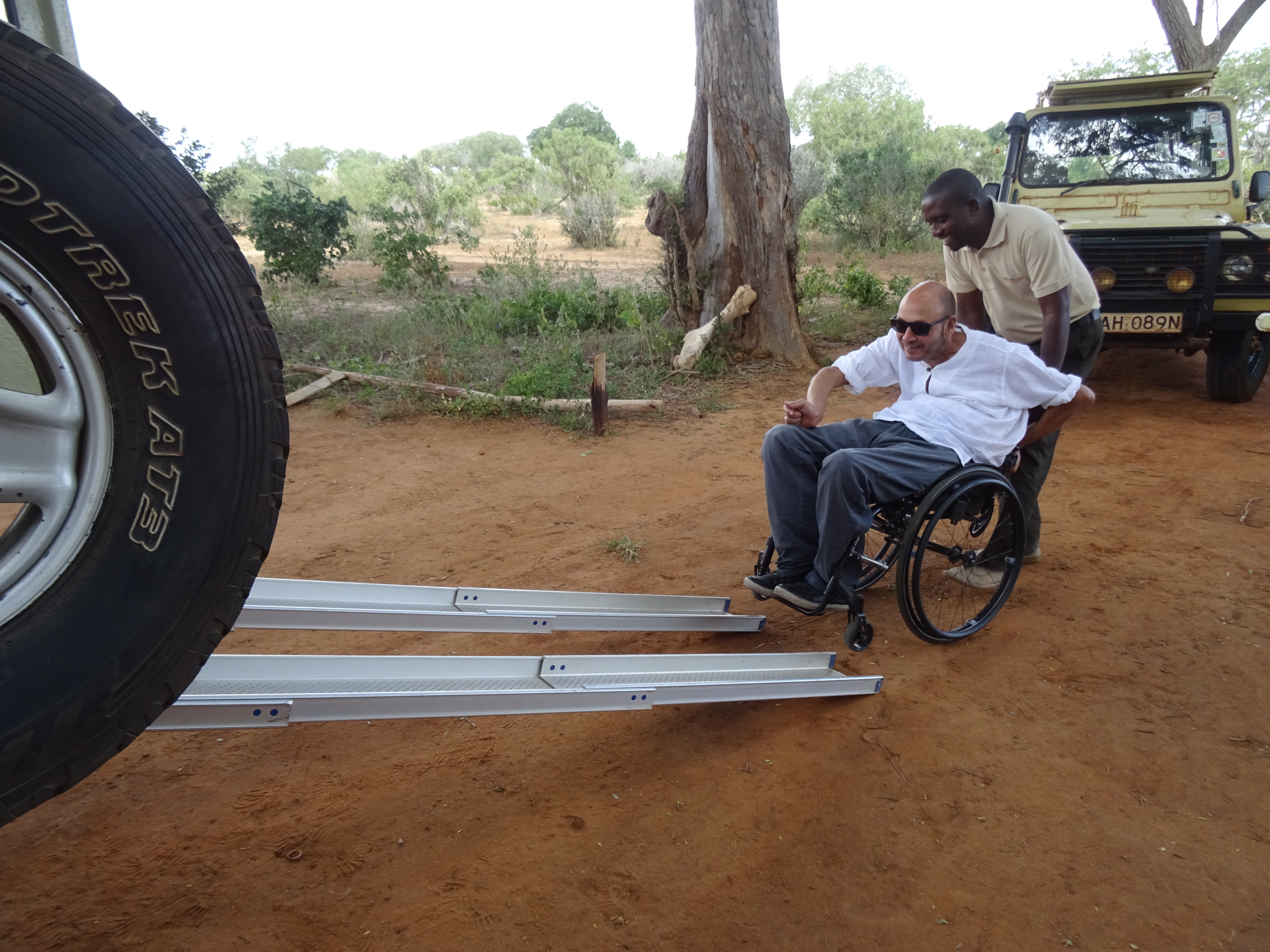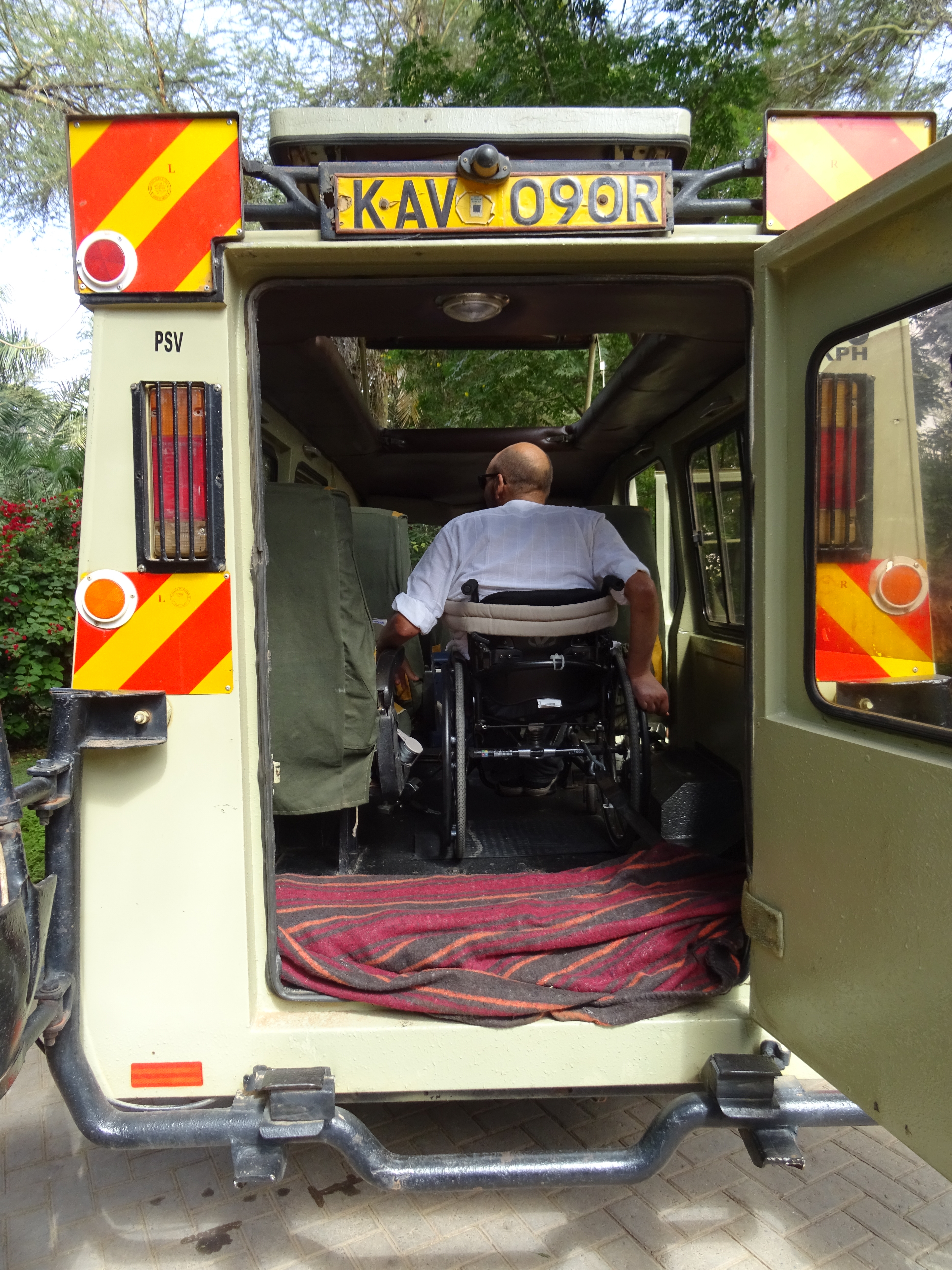 Klar, die Strassen in Kenia können holprig sein und man wird zeitweise durchgeschüttelt! Die gute Federung der Fahrzeuge und die professionelle Fixierung des Rollstuhls machen die Safari aber zu einem sicheren Erlebnis.