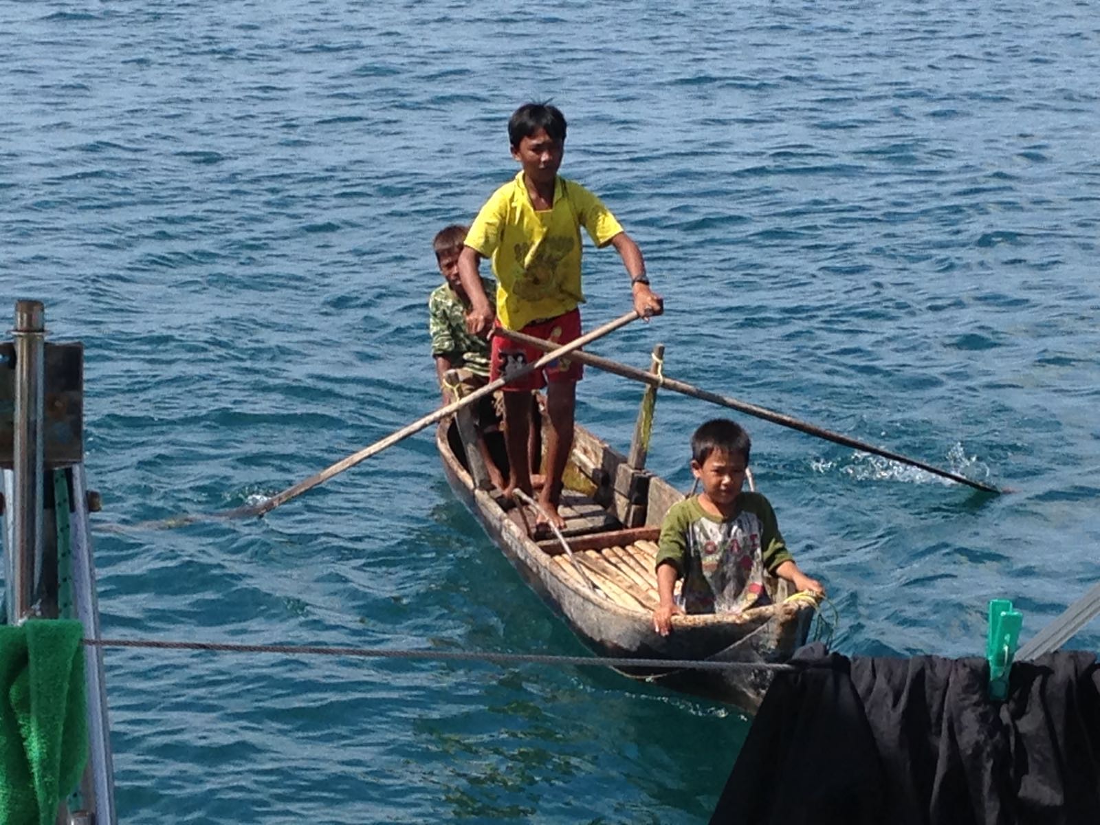 Nur ganz wenige Inseln sind bewohnt. Die Moken, wie die Seemonaden hier genannt werden, haben wenig Kontakt zur Aussenwelt. Umso spannender, wenn mal ein Segelboot in der Nähe ihrer Insel anlegt. Neugierig erkunden diese Kinder unser Boot.