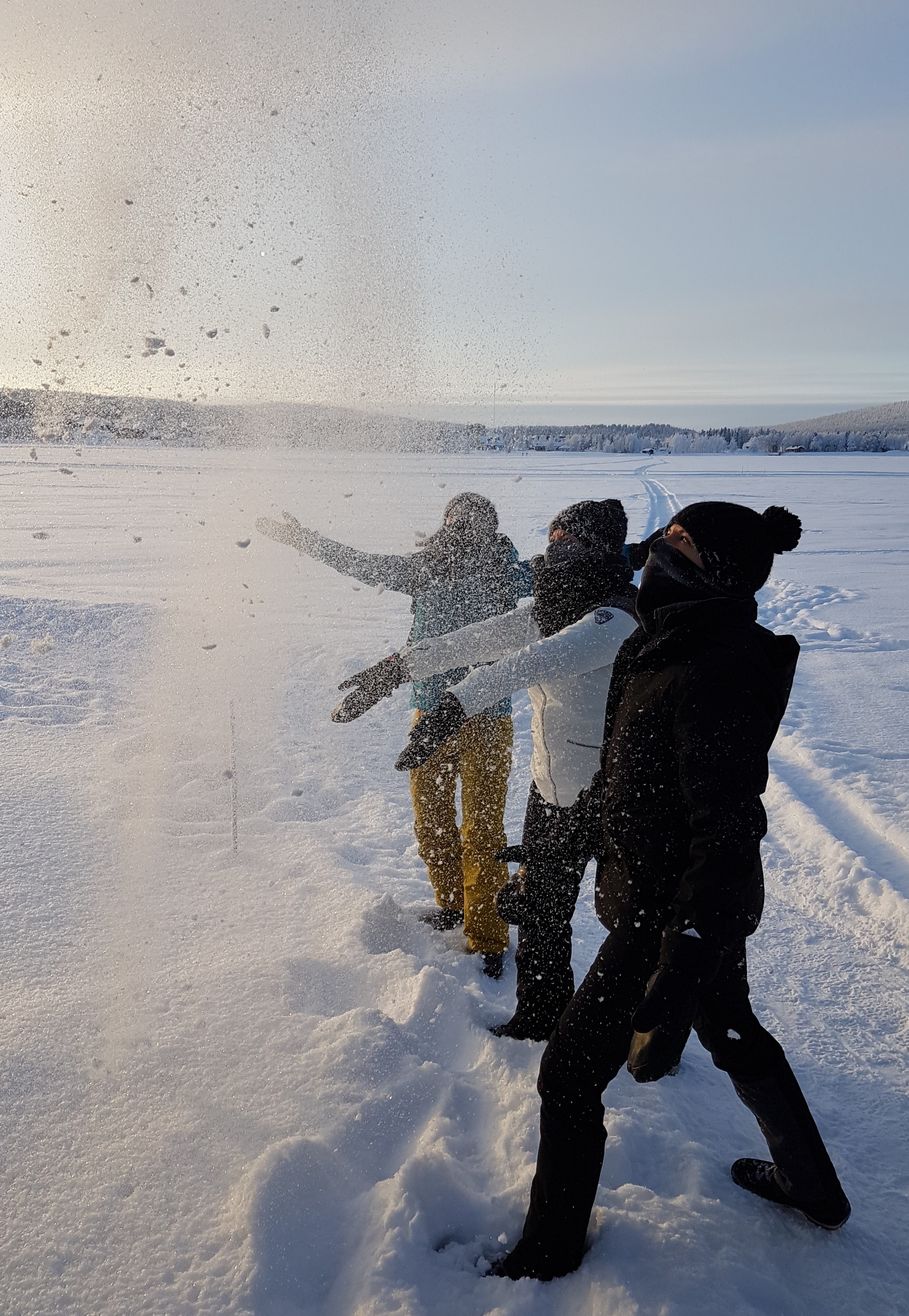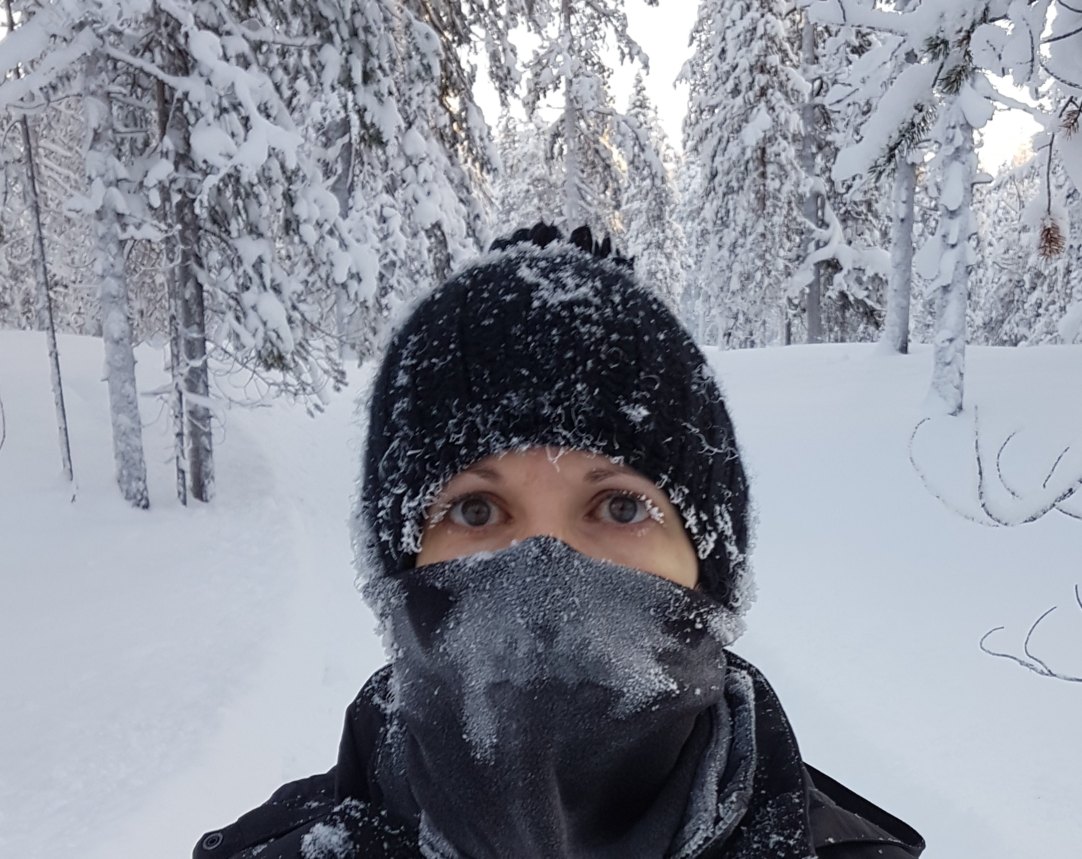 Sehr warm eingepackt erkunden wir die wunderschöne, verschneite Winterlandschaft. Von Dezember bis Januar sind die Tage kurz, und es ist die dunkelste Zeit in Lappland. Gegen zehn Uhr wird es hell und noch vor vier Uhr nachmittags beginnt es bereits wieder zu dämmern.