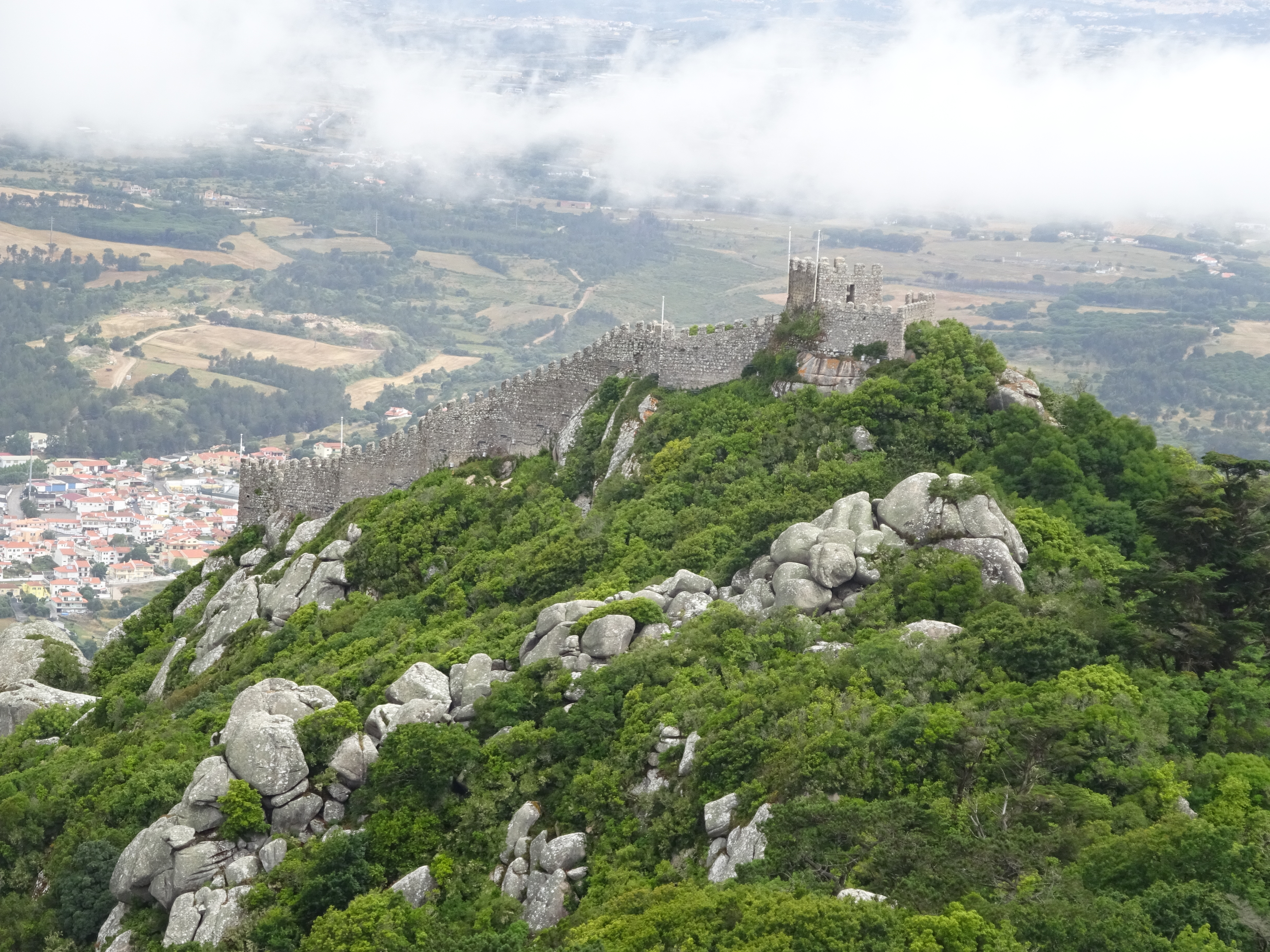 Die mächtige Burganlage thront über der Stadt Sintra wie in einem Ritterfilm. Der mystische Wolkenschleier bildet sich jeweils über dem riesigen Waldgebiet, in dem der Sintra-Nationalpark liegt.