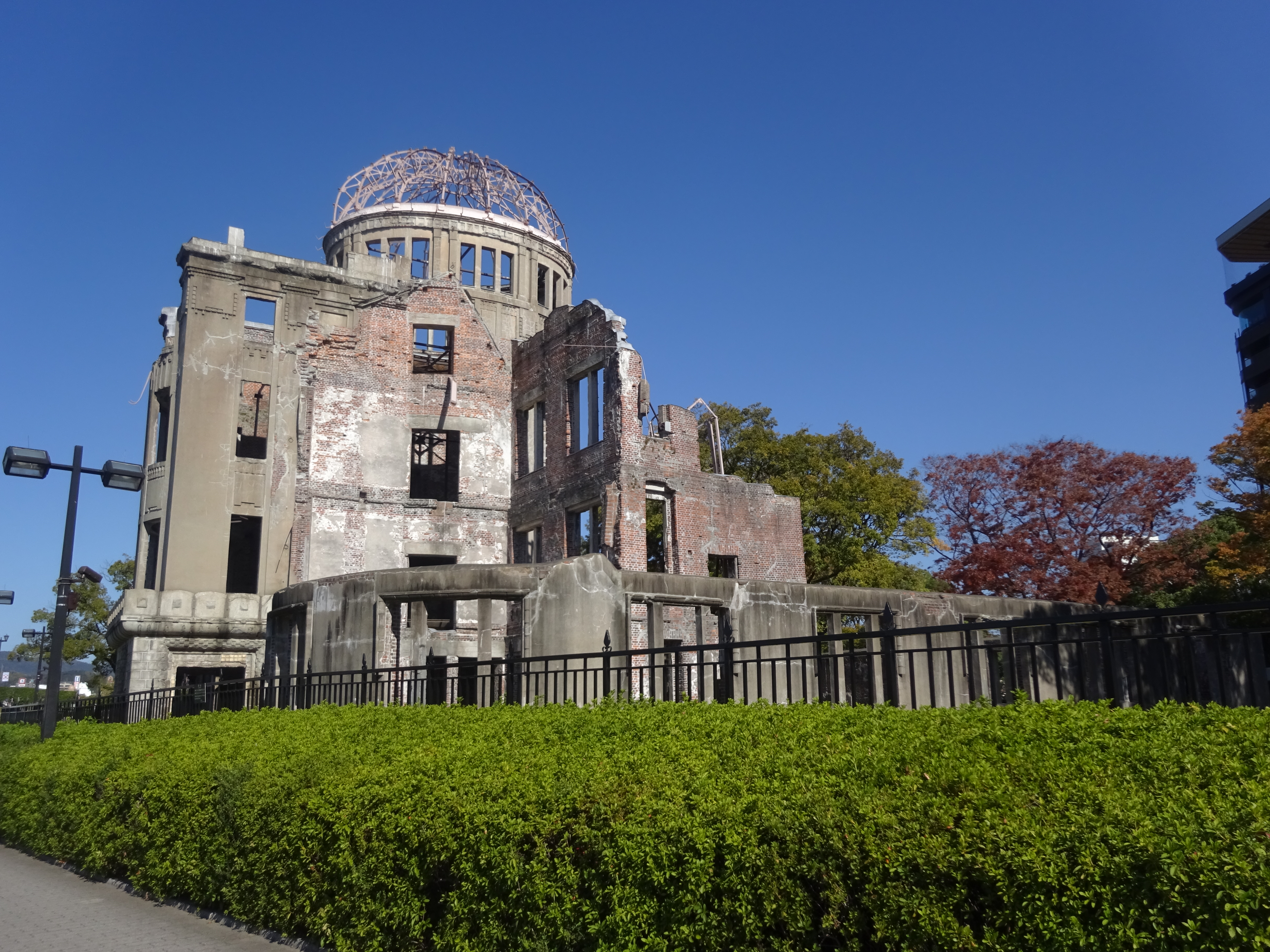 Nach zwei Schnellzugfahrten und einer Tramfahrt erreichen wir Hiroshima. Die Stadt hat eine traurige Geschichte seit dem Niedergang der Atombombe während dem zweiten Weltkrieg. Der A-Bomb Dome ist einer der wenigen erhaltenen Bauten.