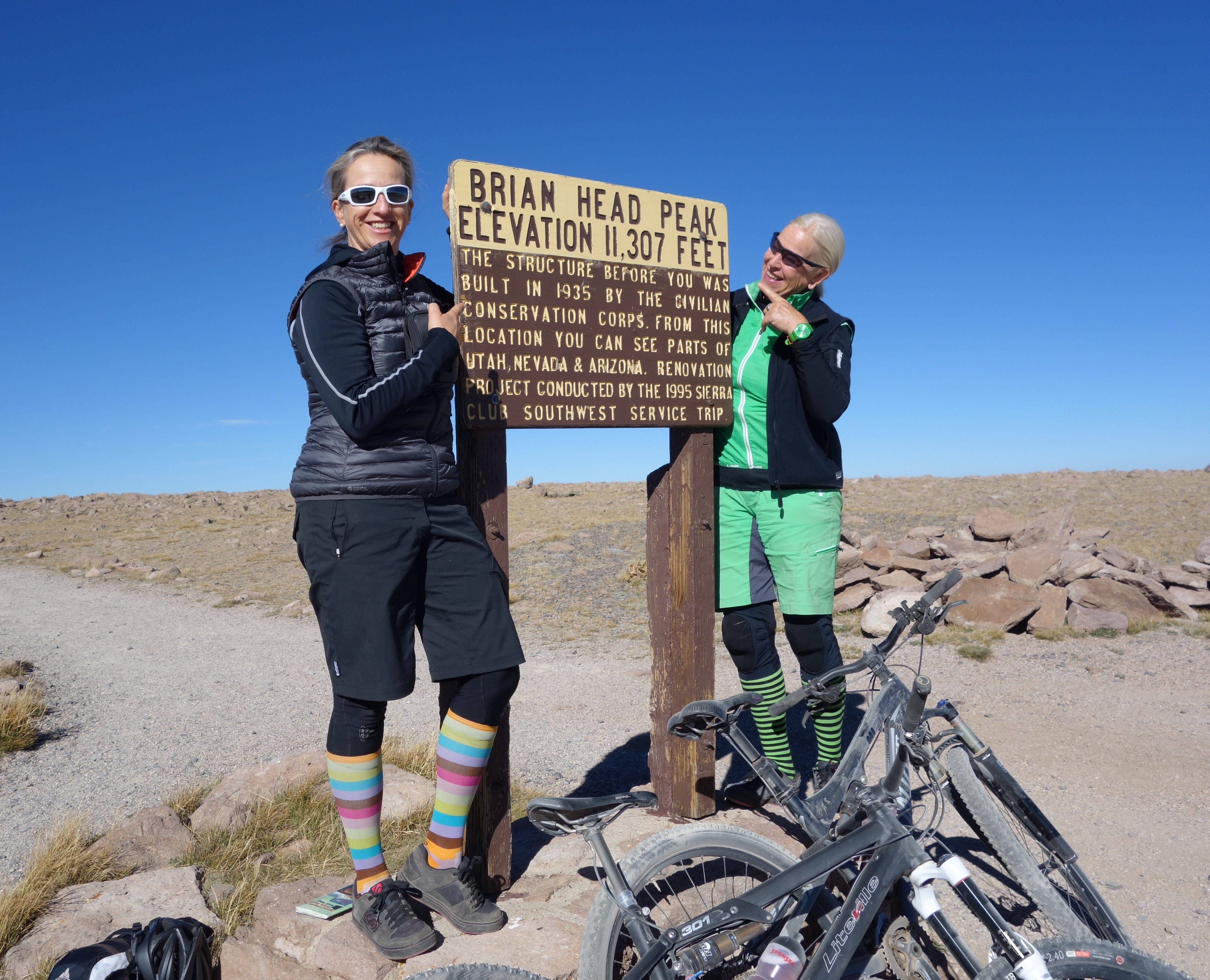 Wir lassen uns von Georg, einem ausgewanderten Österreicher, vom Skiresort Brian Head bis auf den Gipfel auf 3400 Meter hochfahren. Noch kurz ein Gipfelfoto und dann geht's los auf die 20 Kilometer lange Trail-Abfahrt bis zum Lake Penguiche. Wir befinden uns übrigens hier im Staat Utah, in dem viele Mormonen leben.