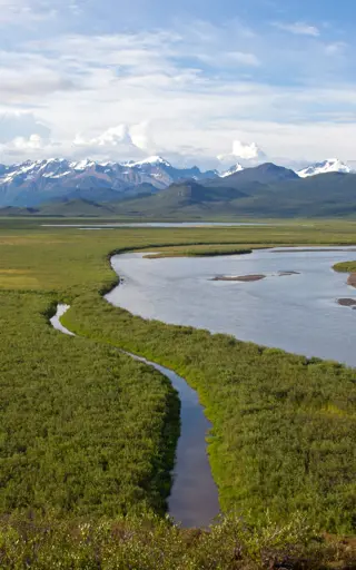 Die Alaskakette ist das höchste Bergmassiv Nordamerikas und umfasst den Mount Denali, den höchsten Berg des Kontinents. Erlebe die ruhigen Seen der Region und beobachte die wilde Karibu- und Vogelwelt oder miete dir ein Kanu und unternimm eine landschaftlich reizvolle Reise auf dem Maclaren River.