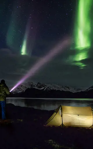 Weg von der Zivilisation in noch ewigem Schnee und Eis. Da findest du einige kleine Hütten, von denen aus du gute Chancen hast, das Polarlicht zu erleben. Alternativ kannst du auch im Zelt übernachten. Die Nordlichter sind tief in der Grönländischen Seele verwurzelt und wenn es am Himmel lodert, dann kommen auch die Grönländer nach draussen - denn für die Inuit sind dies die Geister ihrer Vorfahren.