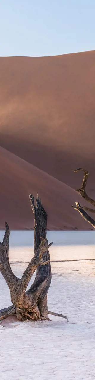 Die berühmte Salzpfanne liegt im Namib-Naukluft Nationalpark. Sie ist bekannt für ihre Sanddünen in der ältesten Wüste der Welt. Am Rand des Nationalparks befinden sich diverse Luxuslodges, die Sossusvlei Lodge ist direkt beim Eingangstor. Im Park selbst gibt es nur eine Unterkunft, die Sossus Dune Lodge. Vorteil: Man kann 30 Minuten vor Sonnenaufgang in den Park fahren - früher als alle anderen und hat die beste Zeit zum Fotografieren.