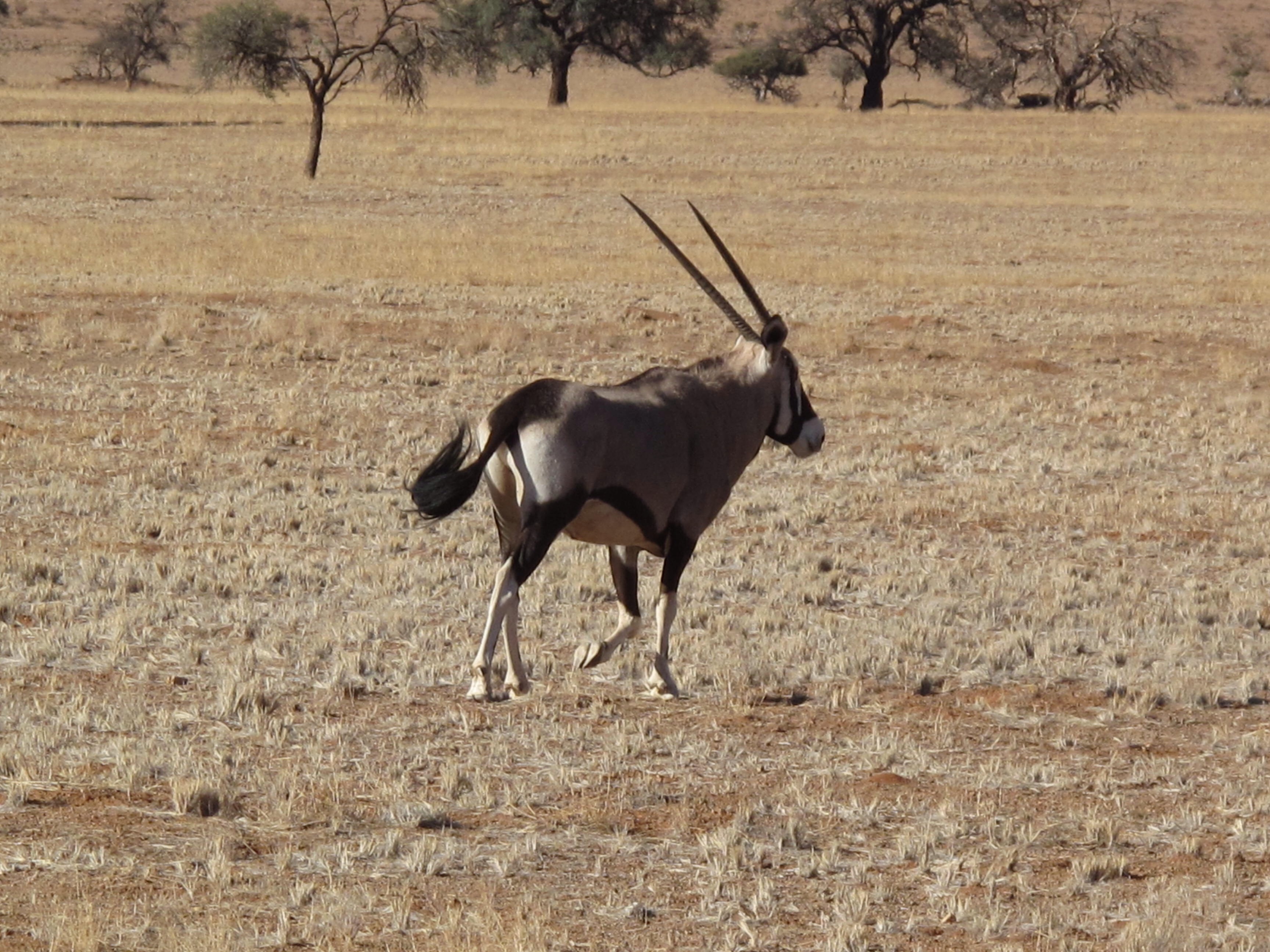 Abfahren ab Windhoek und schon wird die Landschaft trocken und flach. Das Abenteuer beginnt! In der Ferne tauchen die ersten Gemsbok auf.